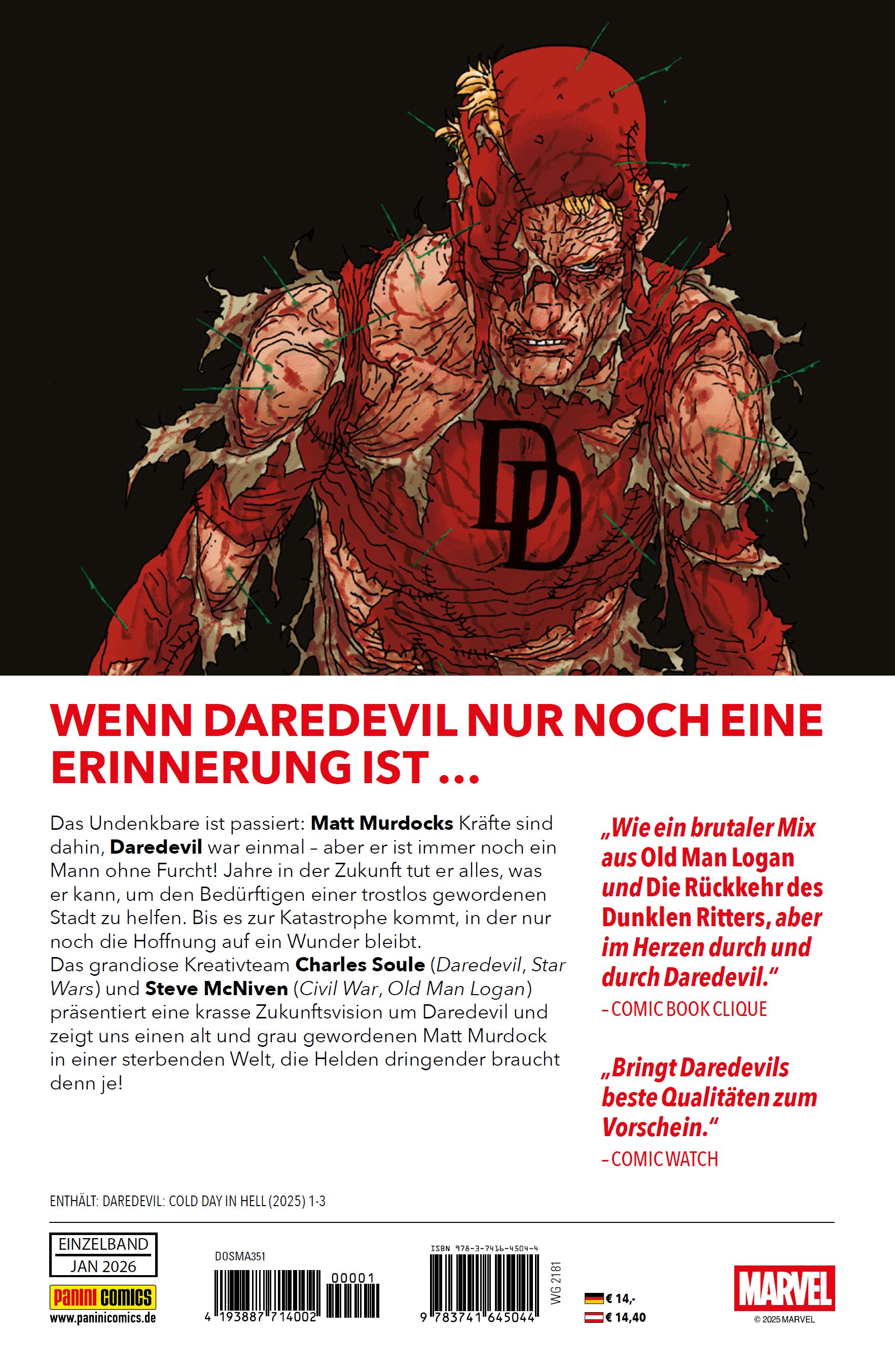 WENN DAREDEVIL NUR NOCH EINE ERINNERUNG IST ... Das Undenkbare ist passiert: Matt Murdocks Kräfte sind dahin, Daredevil war einmal - aber er ist immer noch ein Mann ohne Furcht! Jahre in der Zukunft tut er alles, was er kann, um den Bedürftigen einer trostlos gewordenen Stadt zu helfen. Bis es zur Katastrophe kommt, in der nur noch die Hoffnung auf ein Wunder bleibt. Das grandiose Kreativteam Charles Soule (Daredevil, Star Wars) und Steve McNiven (Civil War, Old Man Logan) präsentiert eine krasse Zukunftsvision um Daredevil und zeigt uns einen alt und grau gewordenen Matt Murdock in einer sterbenden Welt, die Helden dringender braucht denn je! ENTHÄLT: DAREDEVIL: COLD DAY IN HELL (2025) 1-3