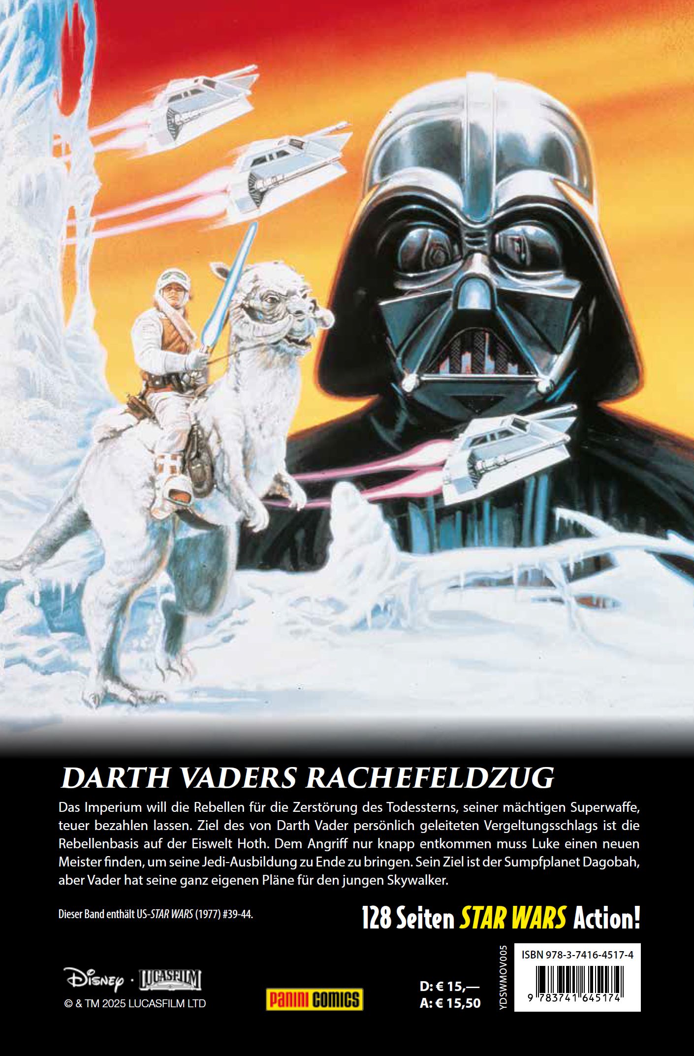 DARTH VADERS RACHEFELDZUG Das Imperium will die Rebellen für die Zerstörung des Todessterns, seiner mächtigen Superwaffe, teuer bezahlen lassen. Ziel des von Darth Vader persönlich geleiteten Vergeltungsschlags ist die Rebellenbasis auf der Eiswelt Hoth. Dem Angriff nur knapp entkommen muss Luke einen neuen Meister finden, um seine Jedi-Ausbildung zu Ende zu bringen. Sein Ziel ist der Sumpfplanet Dagobah, aber Vader hat seine ganz eigenen Pläne für den jungen Skywalker. Dieser Band enthält US-STAR WARS (1977) #39-44.