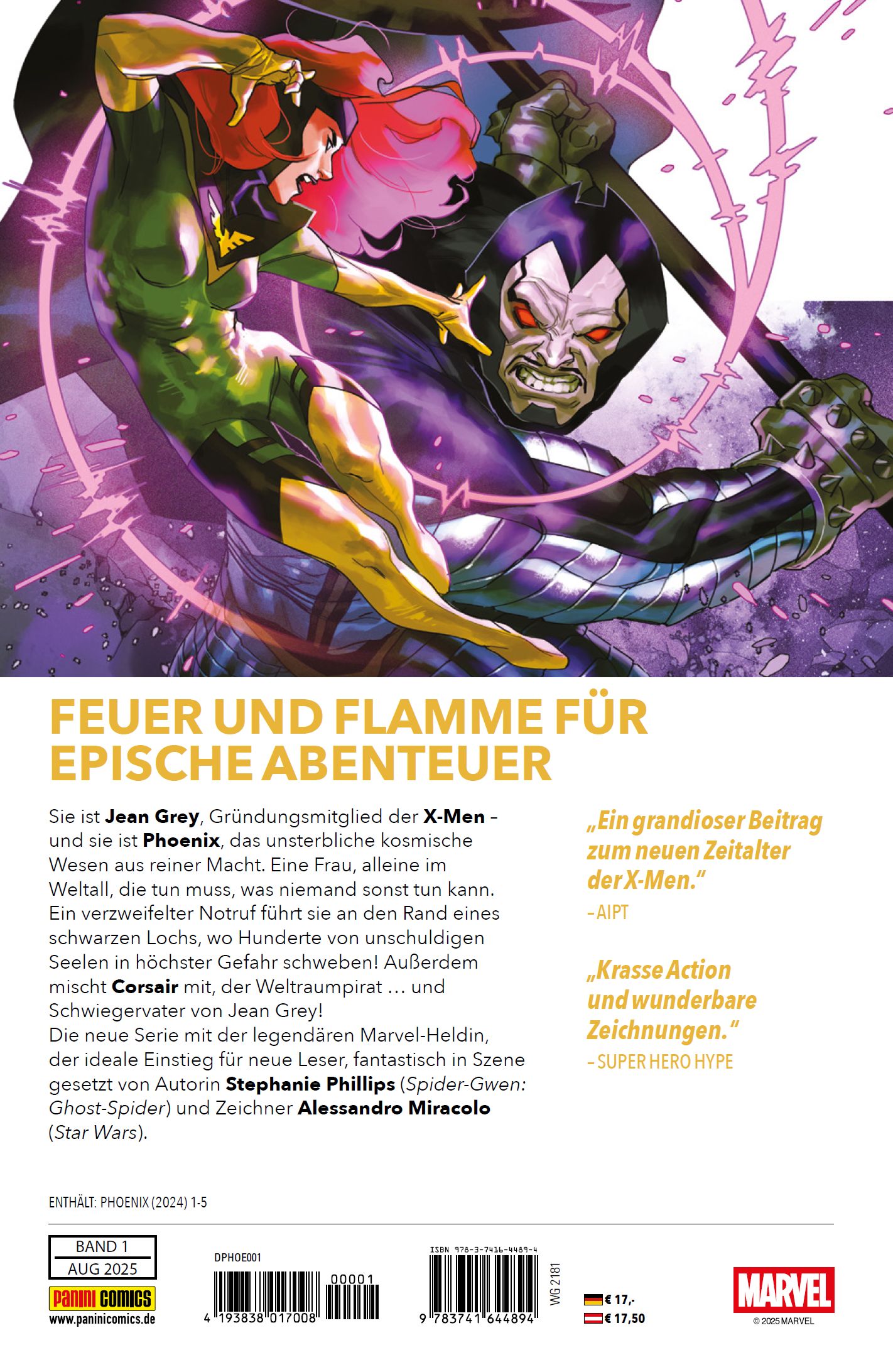 FEUER UND FLAMME FÜR EPISCHE ABENTEUER Sie ist Jean Grey, Gründungsmitglied der X-Men - und sie ist Phoenix, das unsterbliche kosmische Wesen aus reiner Macht. Eine Frau, alleine im Weltall, die tun muss, was niemand sonst tun kann. Ein verzweifelter Notruf führt sie an den Rand eines schwarzen Lochs, wo Hunderte von unschuldigen Seelen in höchster Gefahr schweben! Außerdem mischt Corsair mit, der Weltraumpirat ... und Schwiegervater von Jean Grey! Die neue Serie mit der legendären Marvel-Heldin, der ideale Einstieg für neue Leser, fantastisch in Szene gesetzt von Autorin Stephanie Phillips (Spider-Gwen: Ghost-Spider) und Zeichner Alessandro Miracolo (Star Wars).ENTHÄLT: PHOENIX (2024) 1-5