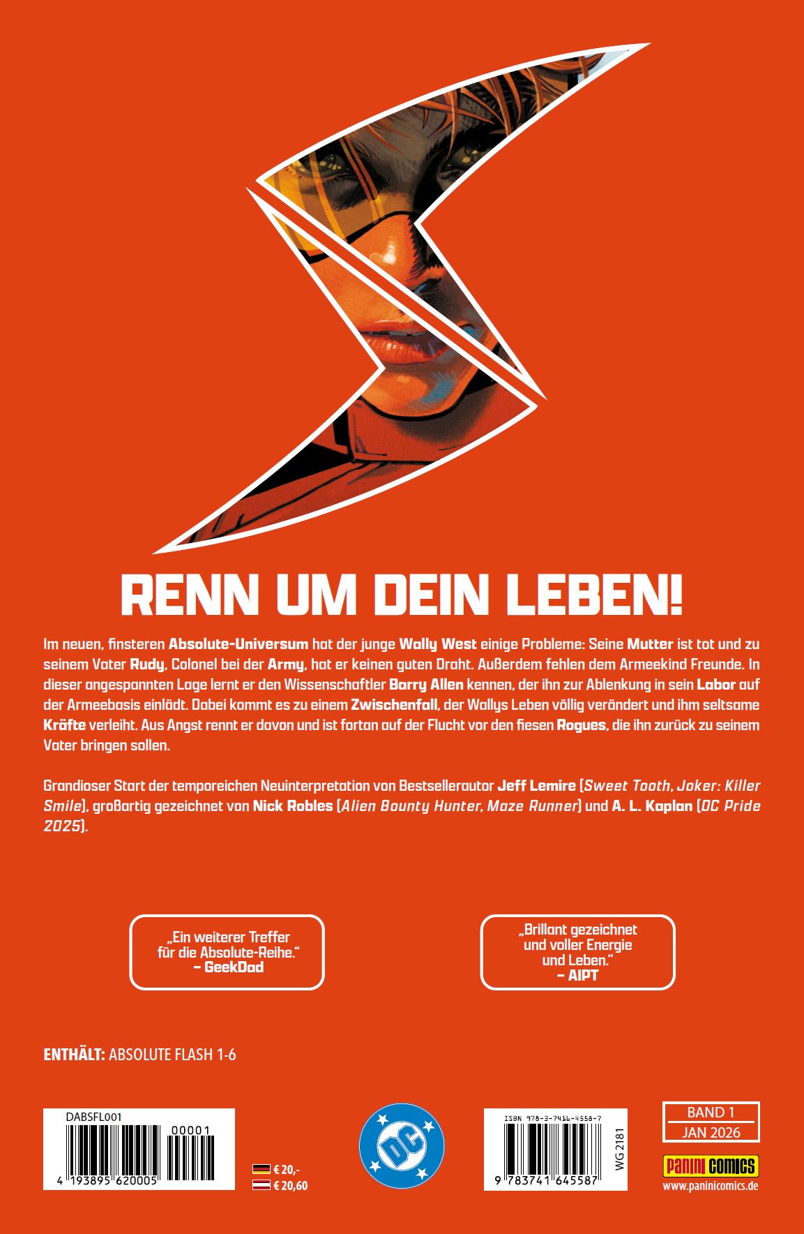 RENN UM DEIN LEBEN! Im neuen, finsteren Absolute-Universum hat der junge Wally West einige Probleme: Seine Mutter ist tot und zu seinem Vater Rudy, Colonel bei der Army, hat er keinen guten Draht. Außerdem fehlen dem Armeekind Freunde. In dieser angespannten Lage lernt er den Wissenschaftler Barry Allen kennen, der ihn zur Ablenkung in sein Labor auf der Armeebasis einlädt. Dabei kommt es zu einem Zwischenfall, der Wallys Leben völlig verändert und ihm seltsame Kräfte verleiht. Aus Angst rennt er davon und ist fortan auf der Flucht vor den fiesen Rogues, die ihn zurück zu seinem Vater bringen sollen. Grandioser Start der temporeichen Neuinterpretation von Bestsellerautor Jeff Lemire (Sweet Tooth, Joker: Killer Smile), großartig gezeichnet von Nick Robles (Alien Bounty Hunter, Maze Runner) und A. L. Kaplan (DC Pride 2025).ENTHÄLT: ABSOLUTE FLASH 1 - 6