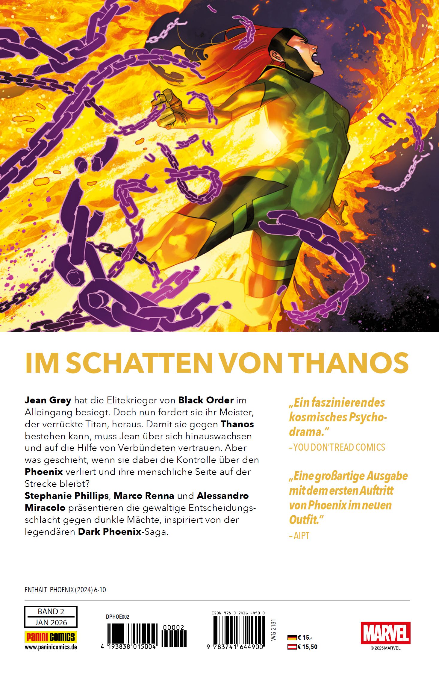 IM SCHATTEN VON THANOS Alleingang besiegt. Doch nun fordert sie ihr Meister, der verrückte Titan, heraus. Damit sie gegen Thanos bestehen kann, muss Jean über sich hinauswachsen und auf die Hilfe von Verbündeten vertrauen. Aber was geschieht, wenn sie dabei die Kontrolle über den Phoenix verliert und ihre menschliche Seite auf der Strecke bleibt? Stephanie Phillips, Marco Renna und Alessandro Miracolo präsentieren die gewaltige Entscheidungsschlacht gegen dunkle Mächte, inspiriert von der legendären Dark Phoenix-Saga. ENTHÄLT: PHOENIX (2024) 6-10