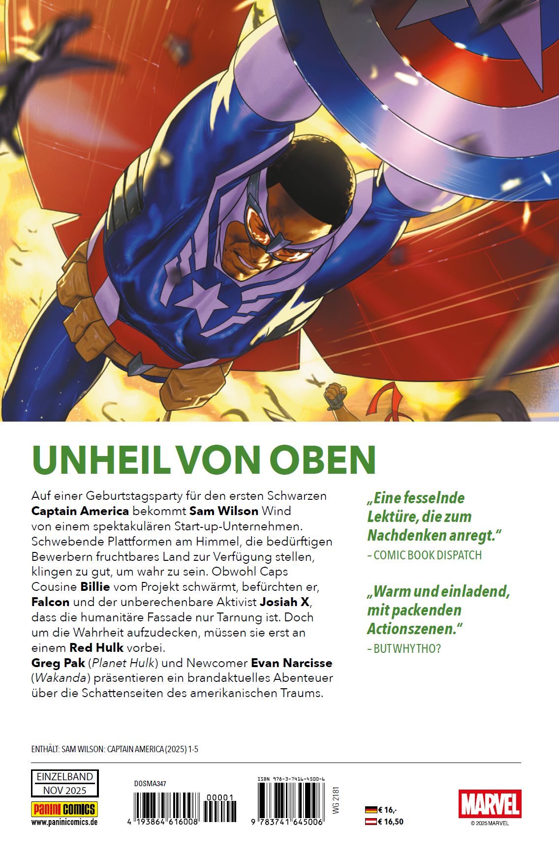 UNHEIL VON OBEN Auf einer Geburtstagsparty für den ersten Schwarzen Captain America bekommt Sam Wilson Wind von einem spektakulären Start-up-Unternehmen. Schwebende Plattformen am Himmel, die bedürftigen Bewerbern fruchtbares Land zur Verfügung stellen, klingen zu gut, um wahr zu sein. Obwohl Caps Cousine Billie vom Projekt schwärmt, befürchten er, Falcon und der unberechenbare Aktivist Josiah X, dass die humanitäre Fassade nur Tarnung ist. Doch um die Wahrheit aufzudecken, müssen sie erst an einem Red Hulk vorbei. Greg Pak (Planet Hulk) und Newcomer Evan Narcisse (Wakanda) präsentieren ein brandaktuelles Abenteuer über die Schattenseiten des amerikanischen Traums.ENTHÄLT: SAM WILSON: CAPTAIN AMERICA (2025) 1-5