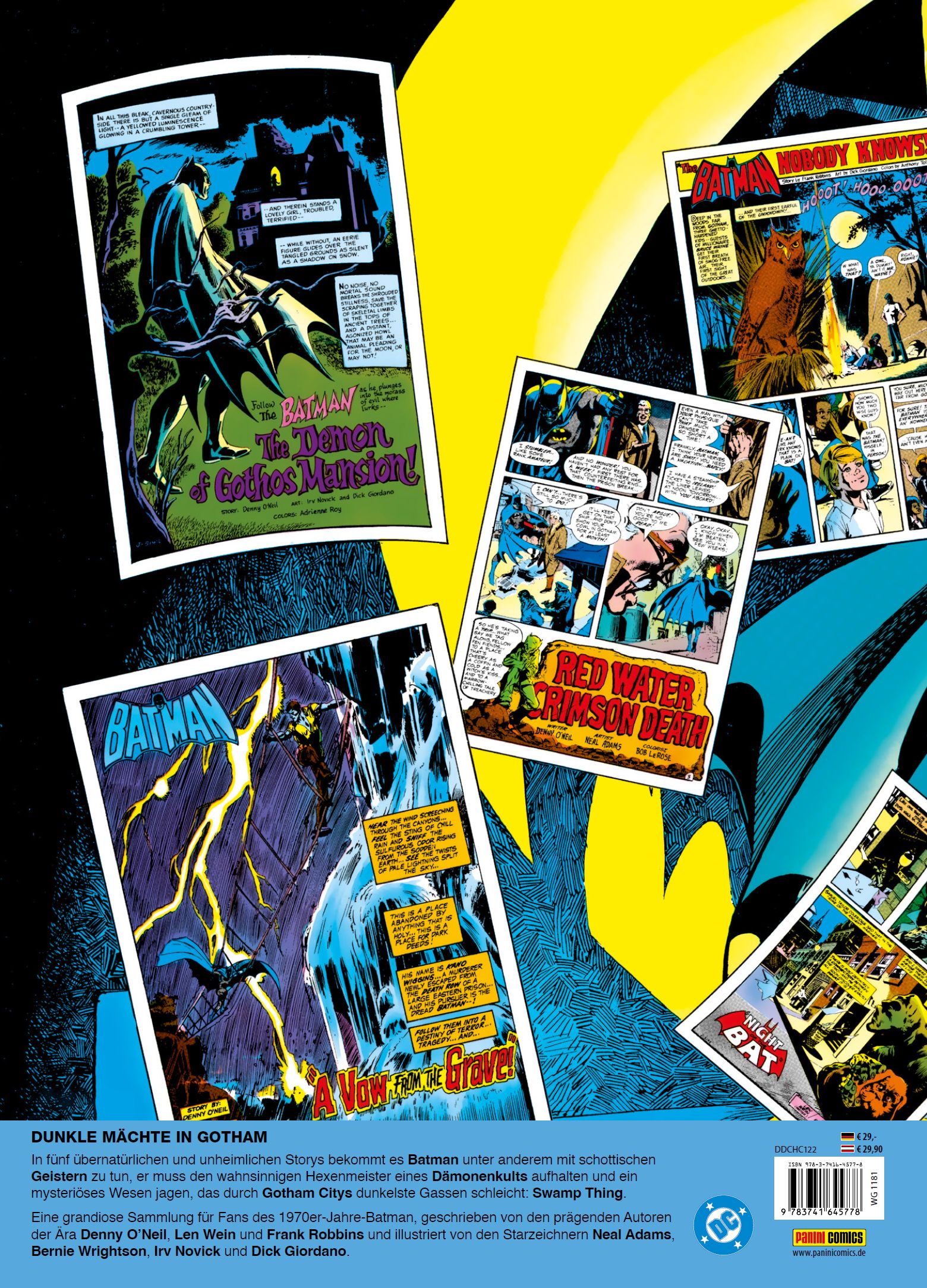 DUNKLE MÄCHTE IN GOTHAMIn fünf übernatürlichen und unheimlichen Storys bekommt es Batman unter anderem mit schottischen Geistern zu tun, er muss den wahnsinnigen Hexenmeister eines Dämonenkults aufhalten und ein mysteriöses Wesen jagen, das durch Gotham Citys dunkelste Gassen schleicht: Swamp Thing. Eine grandiose Sammlung für Fans des 1970er-Jahre-Batman, geschrieben von den prägenden Autoren der Ära Denny O'Neil, Len Wein und Frank Robbins und illustriert von den Starzeichnern Neal Adams, Bernie Wrightson, Irv Novick und Dick Giordano.