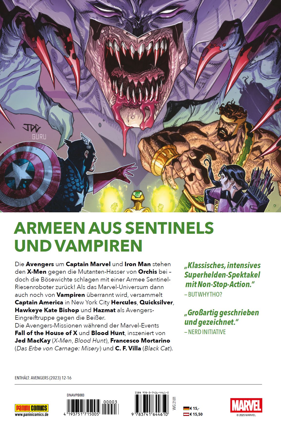 ARMEEN AUS SENTINELS UND VAMPIREN Die Avengers um Captain Marvel und Iron Man stehen den X-Men gegen die Mutanten-Hasser von Orchis bei - doch die Bösewichte schlagen mit einer Armee Sentinel- Riesenroboter zurück! Als das Marvel-Universum dann auch noch von Vampiren überrannt wird, versammelt Captain America in New York City Hercules, Quicksilver, Hawkeye Kate Bishop und Hazmat als Avengers- Eingreiftruppe gegen die Beißer. Die Avengers-Missionen während der Marvel-Events Fall of the House of X und Blood Hunt, inszeniert von Jed MacKay (X-Men, Blood Hunt), Francesco Mortarino (Das Erbe von Carnage: Misery) und C. F. Villa (Black Cat). ENTHÄLT: AVENGERS (2023) 12-16