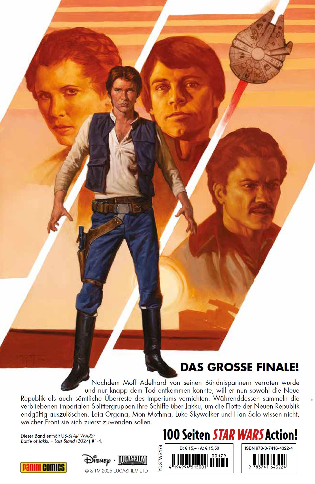 DAS GROSSE FINALE!Nachdem Moff Adelhard von seinen Bündnispartnern verraten wurde und nur knapp dem Tod entkommen konnte, will er nun sowohl die Neue Republik als auch sämtliche Überreste des Imperiums vernichten. Währenddessen sammeln die verbliebenen imperialen Splittergruppen ihre Schiffe über Jakku, um die Flotte der Neuen Republik endgültig auszulöschen. Leia Organa, Mon Mothma, Luke Skywalker und Han Solo wissen nicht, welcher Front sie sich zuerst zuwenden sollen. Dieser Band enthält US-STAR WARS: Battle of Jakku - Last Stand (2024) #1-4.