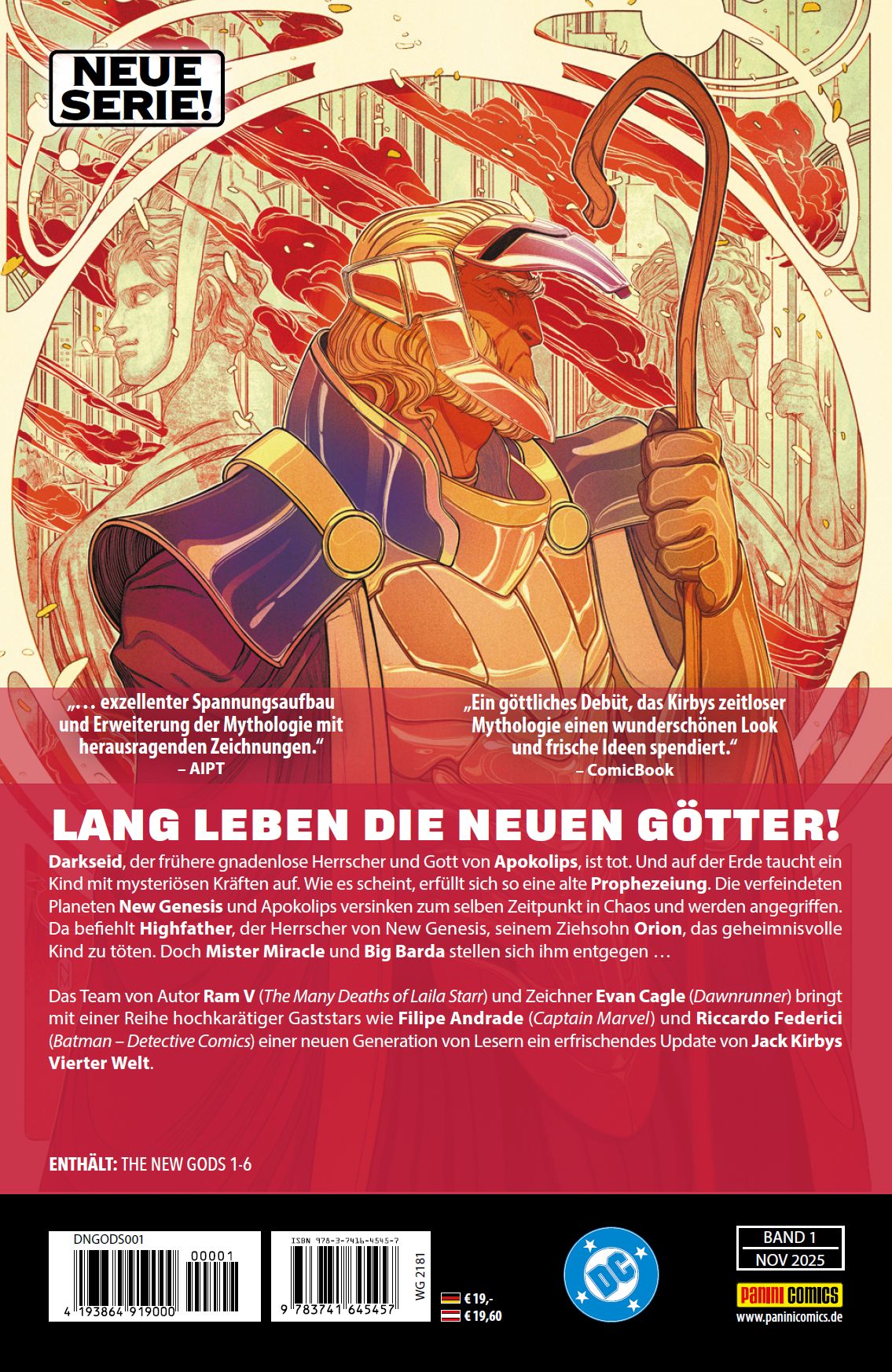 LANG LEBEN DIE NEUEN GÖTTER Darkseid, der frühere gnadenlose Herrscher und Gott von Apokolips, ist tot. Und auf der Erde taucht ein Kind mit mysteriösen Kräften auf. Wie es scheint, erfüllt sich so eine alte Prophezeiung. Die verfeindeten Planeten New Genesis und Apokolips versinken zum gleichen Zeitpunkt in Chaos und werden angegriffen. Da befiehlt Highfather, der Herrscher von New Genesis, seinem Ziehsohn Orion, das geheimnisvolle Kind zu töten. Doch Mister Miracle und Big Barda stellen sich ihm entgegen ... Das Team von Autor Ram V (The Many Deaths of Laila Starr) und Zeichner Evan Cagle (Dawnrunner) bringt mit einer Reihe hochkarätiger Gaststars wie Filipe Andrade (Captain Marvel) und Riccardo Federici (Batman - Detective Comics) einer neuen Generation Lesern ein erfrischendes Update von Jack Kirbys Vierter Welt.ENTHÄLT: THE NEW GODS 1-6