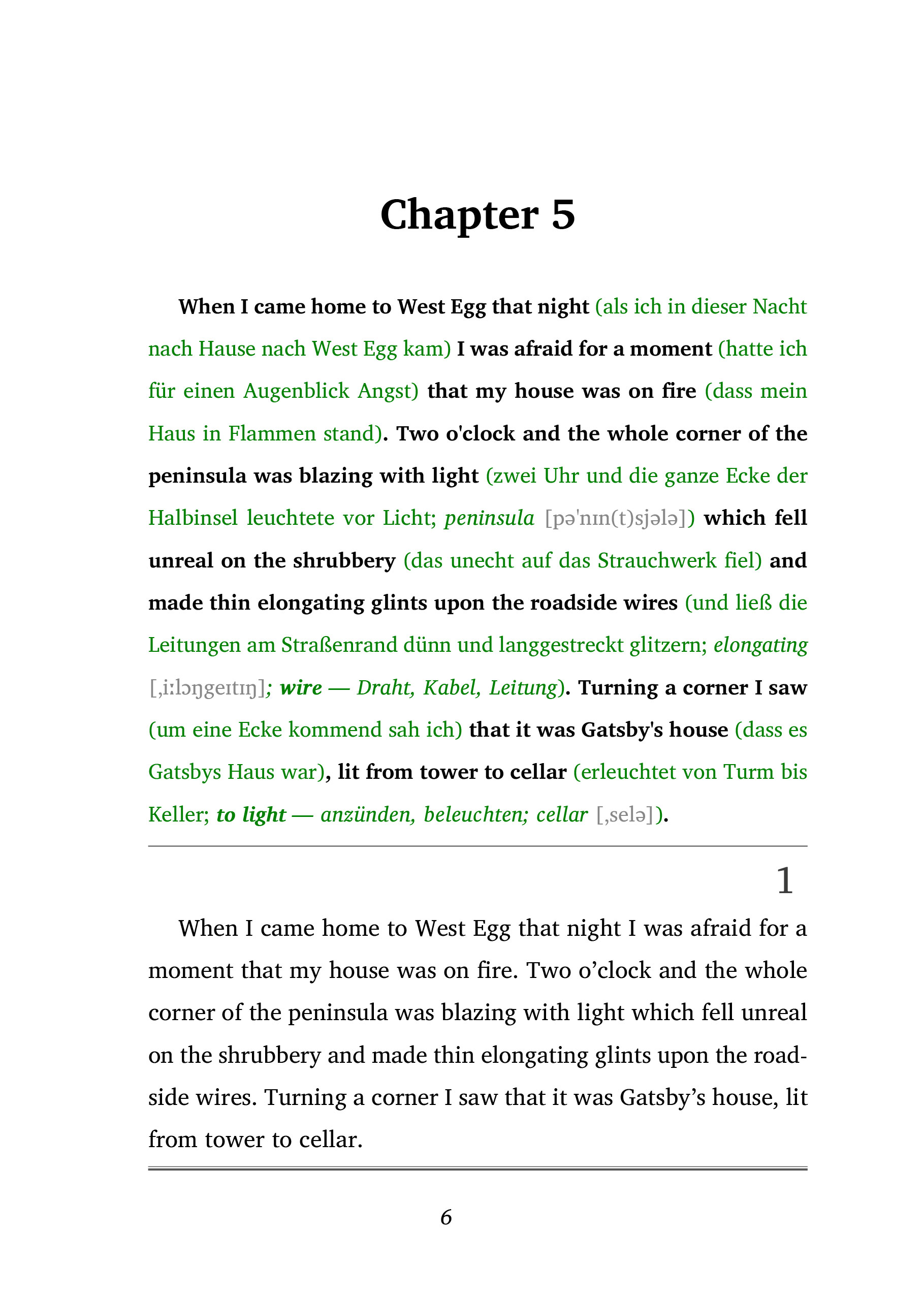 The Great Gatsby - Ein moderner Klassiker mit der Frank-Lesemethode (B1-B2)Originaltext. Ungekürzt. Verständlich. Frank-Lesemethode.Erleben Sie die Goldenen Zwanziger mit all ihrem Glanz, ihrer Sehnsucht - und ihrer Leere. The Great Gatsby von F. Scott Fitzgerald gilt als einer der bedeutendsten Romane der amerikanischen Literatur. Diese Ausgabe enthält den vollständigen Originaltext - authentisch und ungekürzt, aber durch die Frank-Lesemethode auch für fortgeschrittene Englischlernende verständlich gemacht.Die Frank-Lesemethode bietet eine einzigartige Möglichkeit, literarische Werke im Original zu lesen - mit sofort verständlichen Übersetzungen und klaren Erklärungen direkt im Text. Ohne Vokabellisten. Ohne ständiges Nachschlagen. So vertiefen Sie Ihre Sprachkenntnisse auf B1-B2-Niveau - und genießen dabei echte Weltliteratur.Tauchen Sie ein in die geheimnisvolle Welt von Jay Gatsby, der für eine verlorene Liebe alles riskiert. The Great Gatsby ist nicht nur eine Geschichte über Reichtum und Illusionen, sondern auch eine Reflexion über Träume, Gesellschaft und den amerikanischen Traum.Für alle, die ihre Englischkenntnisse erweitern und dabei ein Meisterwerk der Weltliteratur erleben möchten.Inklusive kostenlosem Hörbuch zum Mitlesen und Trainieren des Hörverstehens.Leseprobe: https://easyoriginal.com/leseproben/DE53.pdf