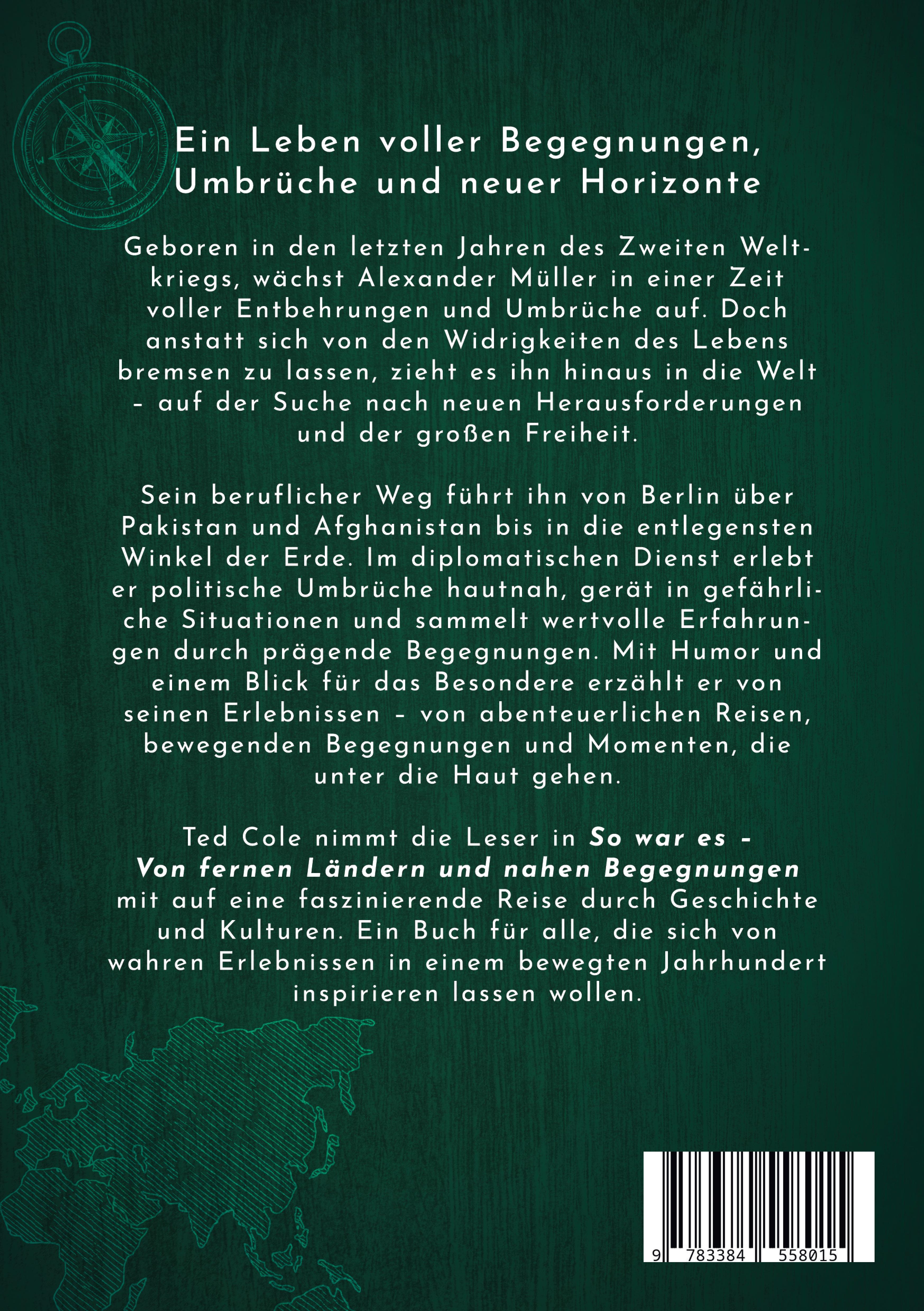 Mein Buch erzählt die bewegende Lebensgeschichte von Alexander Müller, der in den letzten Jahren des Zweiten Weltkriegs geboren wurde und in einer Zeit des Wandels aufwächst. Auf der Suche nach Freiheit und neuen Herausforderungen führt ihn sein beruflicher Weg von Berlin über Pakistan und Afghanistan bis in die entlegensten Winkel der Erde. Als Diplomat erlebt er politische Umbrüche hautnah, gerät in gefährliche Situationen und begegnet faszinierenden Menschen. Mit Humor und Tiefgang erzählt das Buch von abenteuerlichen Reisen, prägenden Begegnungen und bewegenden Momenten.