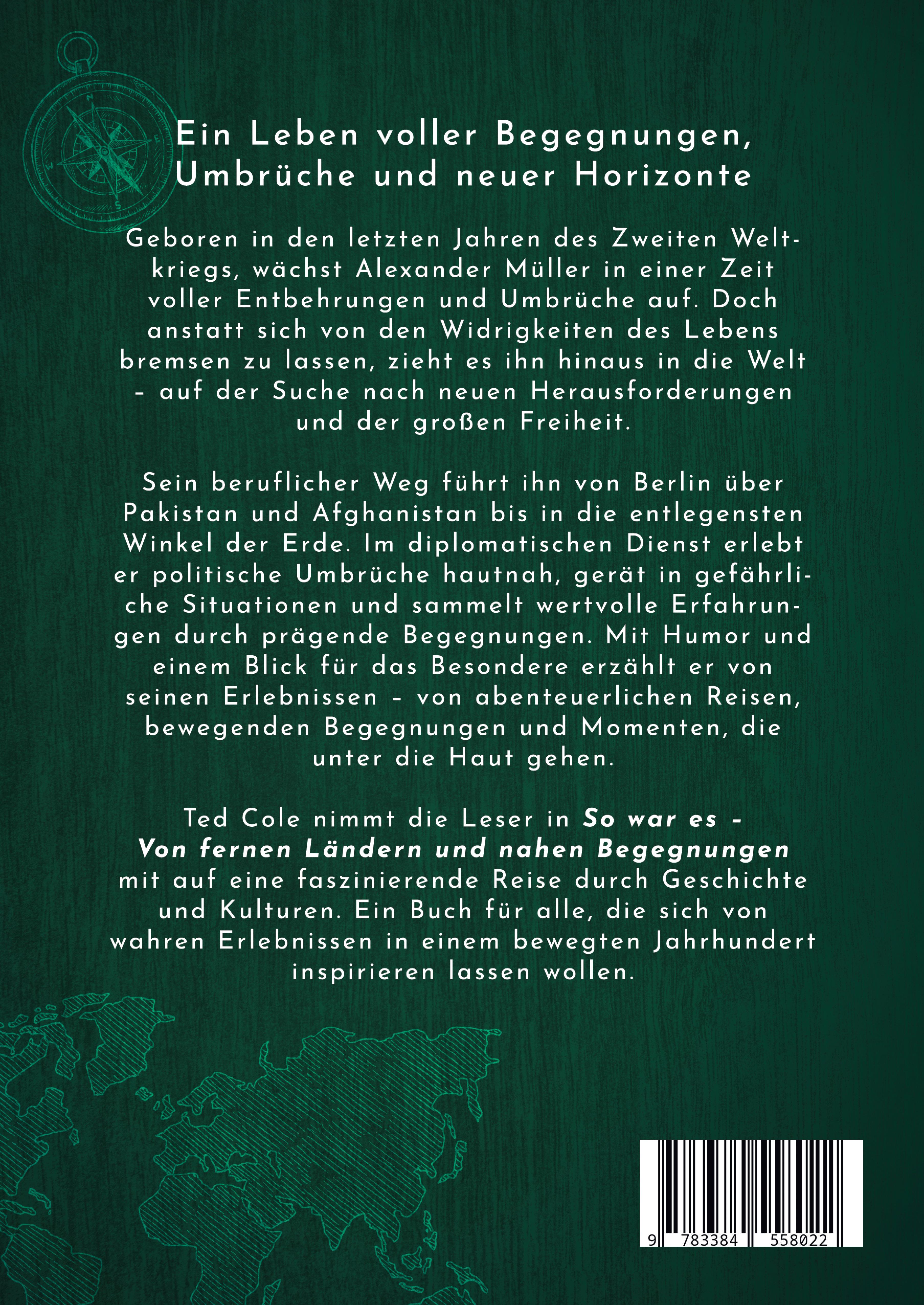 Mein Buch erzählt die bewegende Lebensgeschichte von Alexander Müller, der in den letzten Jahren des Zweiten Weltkriegs geboren wurde und in einer Zeit des Wandels aufwächst. Auf der Suche nach Freiheit und neuen Herausforderungen führt ihn sein beruflicher Weg von Berlin über Pakistan und Afghanistan bis in die entlegensten Winkel der Erde. Als Diplomat erlebt er politische Umbrüche hautnah, gerät in gefährliche Situationen und begegnet faszinierenden Menschen. Mit Humor und Tiefgang erzählt das Buch von abenteuerlichen Reisen, prägenden Begegnungen und bewegenden Momenten.