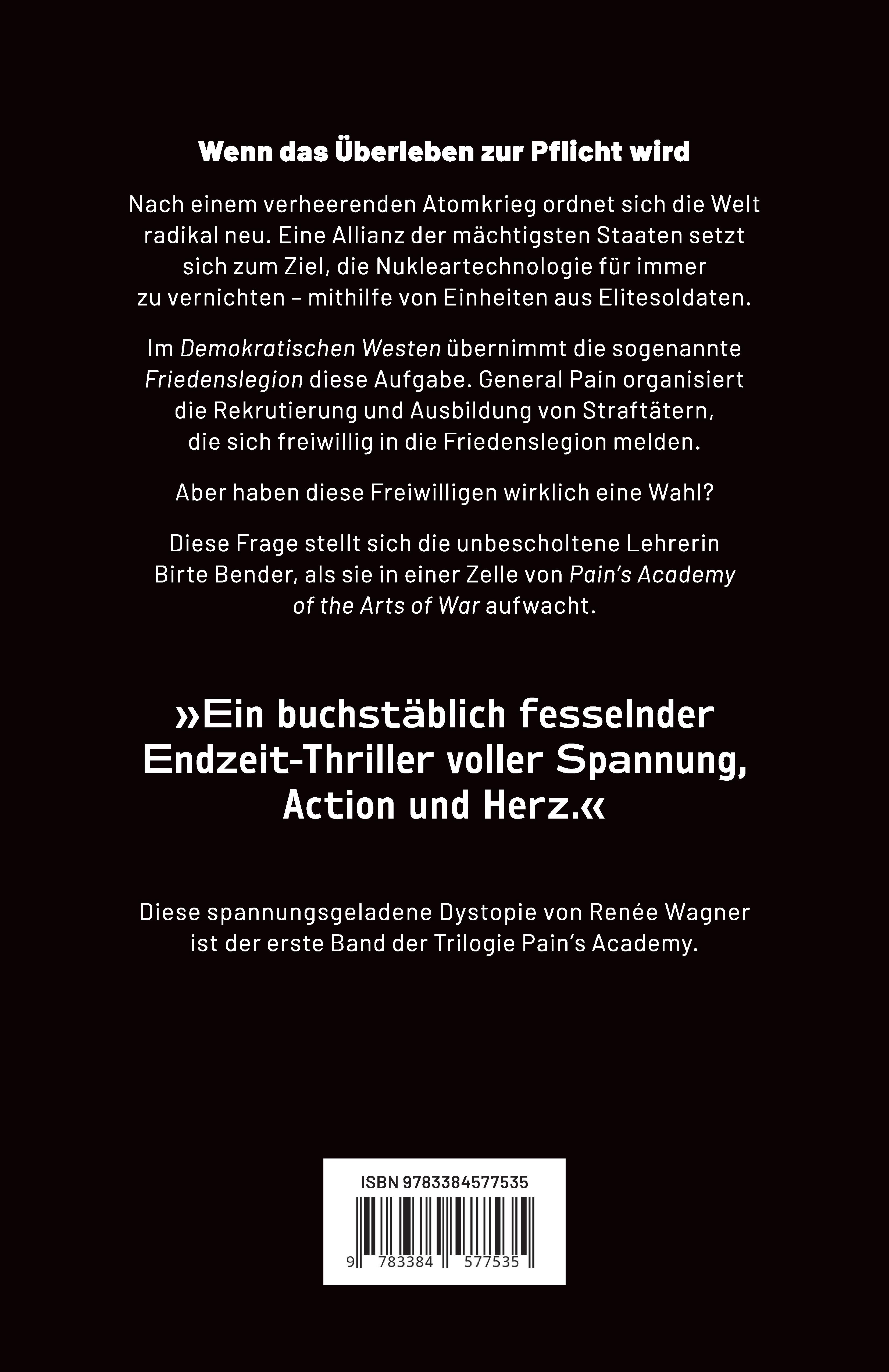 Wenn das Überleben zur Pflicht wird.Nach einem verheerenden Atomkrieg ordnet sich die Welt radikal neu. Eine Allianz der mächtigsten Staaten setzt sich zum Ziel, die Nukleartechnologie für immer zu vernichten - mithilfe von Einheiten aus Elitesoldaten.Im Demokratischen Westen übernimmt die sogenannte Friedenslegion diese Aufgabe. General Pain organisiert die Rekrutierung und Ausbildung von Straftätern, die sich freiwillig in die Friedenslegion melden.Aber haben diese Freiwilligen wirklich eine Wahl?Diese Frage stellt sich die unbescholtene Lehrerin Birte Bender, als sie in einer Zelle in Pain's Academy of the Arts of War aufwacht.Ein buchstäblich fesselnder Endzeit-Thriller voller Spannung, Action und Herz.Diese spannungsgeladene Dystopie ist der erste Band der Trilogie Pain's Academy.Was dich erwartet Eine düstere Zukunftsvision: Die Welt ordnet sich nach einem Atomkrieg politisch und wirtschaftlich neu. Aber die Menschheit kämpft noch ums Überleben. Den Frieden zwischen den Völkern zu bewahren, gestaltet sich schwierig. Immerhin einigen sich die Staaten darauf, in ihren Kriegen die Zivilisten zu schonen. Eine starke Protagonistin: Die Lehrerin Birte Bender wird in ein gnadenloses militärisches Ausbildungslager verschleppt, ihre Identität wird ausgetauscht und sie wird gezwungen, als Soldatin zu handeln und Kameraden zu führen. Doch auch als Offizierin bleibt sie Gefangene dieses unmenschlichen Systems. Moralische Dilemmata: General Pain bedroht die Leben ihres Mannes und ihrer Kinder. Um sie zu schützen, ist Birte gezwungen, als Soldatin in der Friedenslegion zu dienen. Nur ihr Gehorsam rettet ihre Familie. Obwohl Birtes schlechtes Gewissen an ihr nagt, muss sie lernen, zu töten. Doch während sie in brutalen Kriegen um ihrer aller Überleben kämpft, wächst in ihr die Sehnsucht nach Freiheit. Innere Zerrissenheit, Loyalität und Liebe: Während der gnadenlosen Ausbildung in Pain's Academy findet Birte Halt bei John - ihrem Zwangspartner, der ihr Schicksal teilt. Die beiden entwickeln gefährlich innige Gefühle füreinander. Doch Birte liebt auch ihre Familie. Für wen soll sie sich entscheiden, falls sie sich je ihre Freiheit erkämpft? Spannung und Action: Ein fesselnder Plot mit unerwarteten Wendungen, harten Kämpfen und emotionalen Szenen hält die Leserinnen und Leser in Atem.
