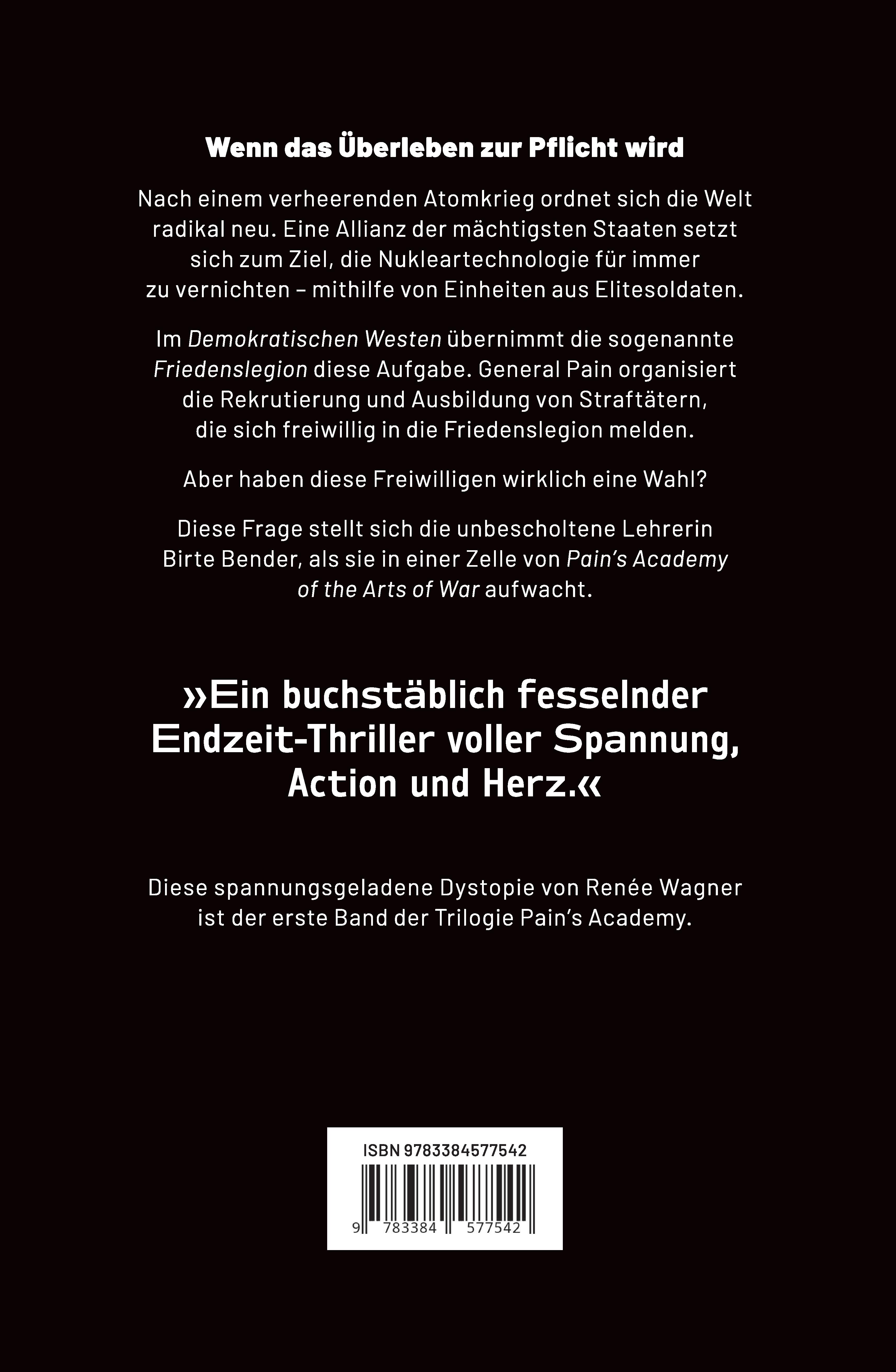 Wenn das Überleben zur Pflicht wird.Nach einem verheerenden Atomkrieg ordnet sich die Welt radikal neu. Eine Allianz der mächtigsten Staaten setzt sich zum Ziel, die Nukleartechnologie für immer zu vernichten - mithilfe von Einheiten aus Elitesoldaten.Im Demokratischen Westen übernimmt die sogenannte Friedenslegion diese Aufgabe. General Pain organisiert die Rekrutierung und Ausbildung von Straftätern, die sich freiwillig in die Friedenslegion melden.Aber haben diese Freiwilligen wirklich eine Wahl?Diese Frage stellt sich die unbescholtene Lehrerin Birte Bender, als sie in einer Zelle in Pain's Academy of the Arts of War aufwacht.Ein buchstäblich fesselnder Endzeit-Thriller voller Spannung, Action und Herz.Diese spannungsgeladene Dystopie ist der erste Band der Trilogie Pain's Academy.Was dich erwartet Eine düstere Zukunftsvision: Die Welt ordnet sich nach einem Atomkrieg politisch und wirtschaftlich neu. Aber die Menschheit kämpft noch ums Überleben. Den Frieden zwischen den Völkern zu bewahren, gestaltet sich schwierig. Immerhin einigen sich die Staaten darauf, in ihren Kriegen die Zivilisten zu schonen. Eine starke Protagonistin: Die Lehrerin Birte Bender wird in ein gnadenloses militärisches Ausbildungslager verschleppt, ihre Identität wird ausgetauscht und sie wird gezwungen, als Soldatin zu handeln und Kameraden zu führen. Doch auch als Offizierin bleibt sie Gefangene dieses unmenschlichen Systems. Moralische Dilemmata: General Pain bedroht die Leben ihres Mannes und ihrer Kinder. Um sie zu schützen, ist Birte gezwungen, als Soldatin in der Friedenslegion zu dienen. Nur ihr Gehorsam rettet ihre Familie. Obwohl Birtes schlechtes Gewissen an ihr nagt, muss sie lernen, zu töten. Doch während sie in brutalen Kriegen um ihrer aller Überleben kämpft, wächst in ihr die Sehnsucht nach Freiheit. Innere Zerrissenheit, Loyalität und Liebe: Während der gnadenlosen Ausbildung in Pain's Academy findet Birte Halt bei John - ihrem Zwangspartner, der ihr Schicksal teilt. Die beiden entwickeln gefährlich innige Gefühle füreinander. Doch Birte liebt auch ihre Familie. Für wen soll sie sich entscheiden, falls sie sich je ihre Freiheit erkämpft? Spannung und Action: Ein fesselnder Plot mit unerwarteten Wendungen, harten Kämpfen und emotionalen Szenen hält die Leserinnen und Leser in Atem.