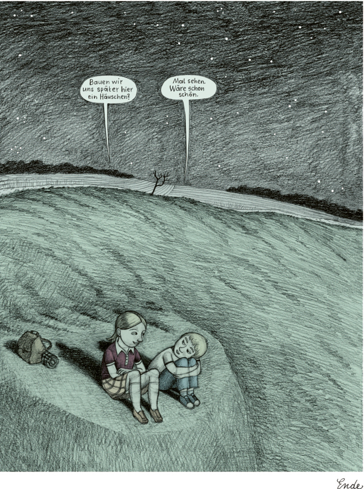 Mitten in einem Mittelgebirge in Deutschland haben die Geschwister Jana und Lutz einen idealen Spielplatz gefunden. Von hier können sie weit ins Land hinausschauen. Von ihren Eltern, Verwandten und Bekannten erfahren sie, dass ihr Lieblingsort auf dem Berg genau im innerdeutschen Grenzstreifen gelegen hat. Sie lernen, wie das war, als Deutschland getrennt war und lernen die Geschichte ihrer Familie kennen. Eindrücklich führt dieser Comic vor Augen wie erdrückend es war, in der DDR zu leben, wenn man die Ideologie des Staates nicht teilte. Vorgeführt wird dies an einer ganz normalen Familie. Die Eltern der kindlichen Helden erleben den brutalen Druck des sozialen Kollektivs, Stasi-Spitzel inklusive. Ende der Achtziger gehen sie in den Westen, der sich dann allerdings ebenfalls als problematisch genug erweist ...