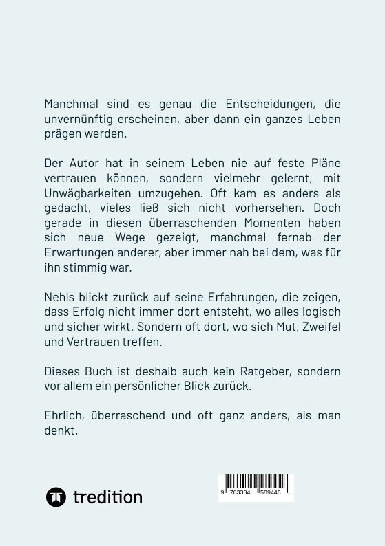 In "Unvernünftig erfolgreich!" erzählt Thomas Nehls seine persönliche Geschichte eines Lebens, das nicht dem klassischen Plan folgte und gerade deshalb erfolgreich wurde. Früh gezwungen, Verantwortung zu übernehmen, lernte er nicht durch perfekte Strategien, sondern durch Mut, Offenheit und das Vertrauen in sein eigenes Gespür.Das Buch zeigt, warum echte Erfüllung oft dort entsteht, wo man sich gegen vermeintliche Vernunft und äußere Erwartungen stellt. Wie Umwege, Krisen und überraschende Entscheidungen zu wichtigen Wendepunkten werden. Dass Erfolg nicht nur eine Frage von Zielen und Karriere ist, sondern vor allem von Echtheit, Anpassungsfähigkeit und innerer Klarheit.Mit einer Mischung aus Lebenserfahrung, Reflektion und Inspiration lädt Thomas Nehls dazu ein, den eigenen Weg zu erkennen, auch wenn er unvernünftig erscheinen mag.Ein lebensnahes Buch über Mut, Wandel und die stille Freude, sich selbst treu geblieben zu sein.