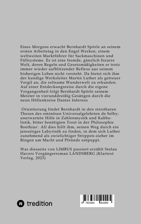 Eines Morgens erwacht Bernhardt Spörle an seinem ersten Arbeitstag in den Engel Werken, einem weltweiten Marktführer für Sackmaschinen und Füllsysteme. Es ist eine fremde, gänzlich bizarre Welt, deren Regeln und Gesetzmäßigkeiten er trotz immer wieder aufblitzender Reflexe aus seinem bisherigen Leben nicht versteht. Da bietet sich ihm der kundige Werksleiter Martin Luther als getreuer Vergil an, die seltsame Wunderwelt zu erkunden. Auf einer Entdeckungsreise durch die eigene Vergangenheit folgt Bernhardt Spörle seinem Meister in vierunddreißig Gesängen durch die neun Höllenkreise Dantes Infernos.Orientierung findet Bernhardt in den streitbaren Thesen des ominösen Universalgelehrten de Selby; unerwartete Hilfe in Zahlenmystik und Kabbalistik, bitter benötigten Trost in der Philosophie Boethius'. All dies hilft ihm, seinen Weg durch ein jenseitiges Labyrinth zu finden, in dem sich Luther zunehmend als zwielichtiger Strippenzieher im Ringen um Macht und Pfründe entpuppt.Was diesseits von LIMBUS passiert erzählt Stefan Havers Vorgängerroman LANDSBERG (Klartext Verlag, 2023)