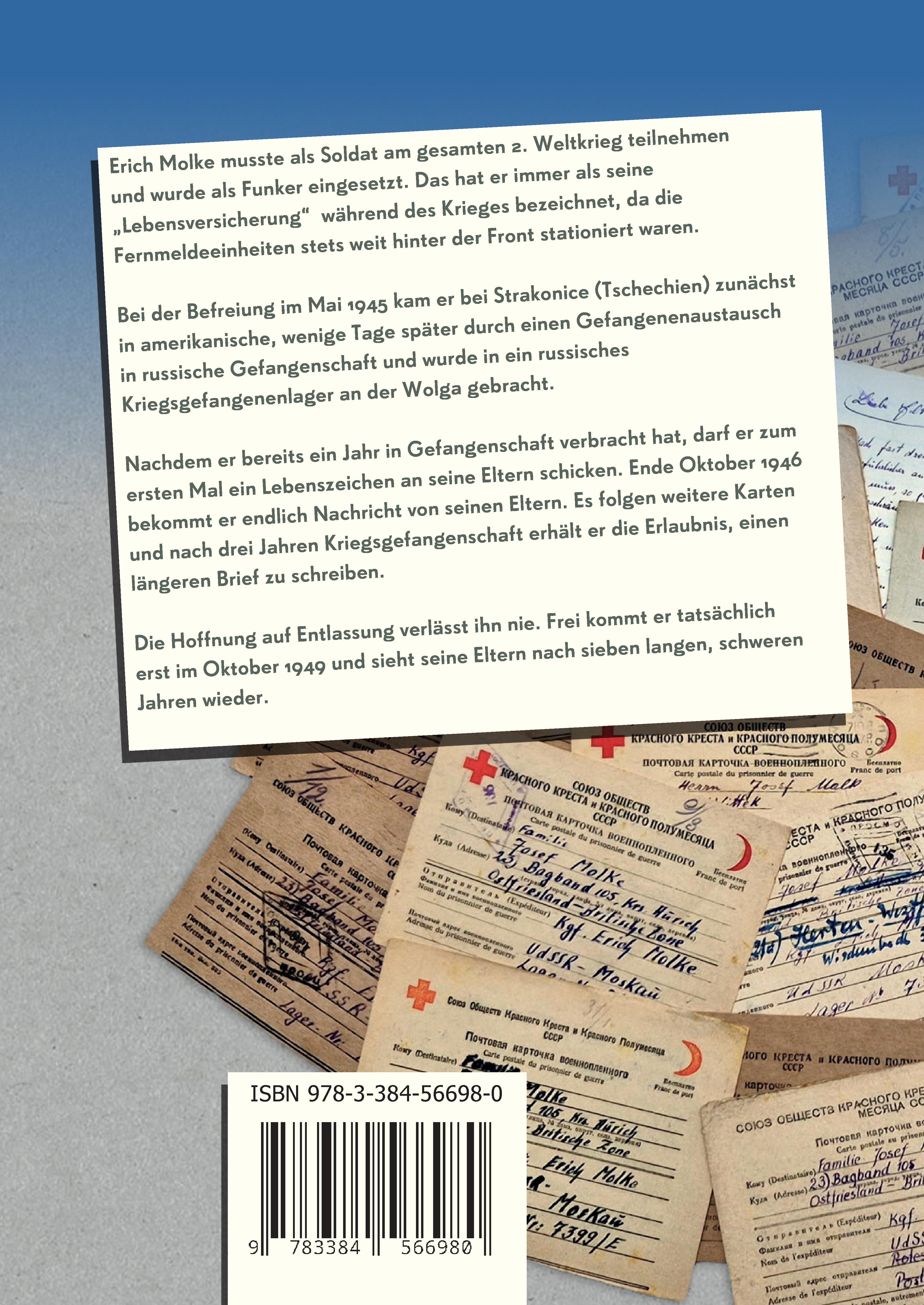 Erich Molke, geb. am 19.11.1921, musste als Soldat am gesamten 2. Weltkrieg teilnehmen und wurde als Funker eingesetzt. Das hat er immer als seine "Lebensversicherung" während des Krieges bezeichnet, da die Fernmeldeeinheiten stets weit hinter der Front stationiert waren. In Erzählungen hat er eine Fahrt mit Fischern auf dem Schwarzen Meer von der Halbinsel Krim aus als einen der wenigen glücklichen Momente während des ganzen Krieges bezeichnet. Beim Rückzug der deutschen Truppen kam Erich bei der Befreiung im Mai 1945 bei Strakonice (Tschechien) zunächst in amerikanische, wenige Tage später durch einen Gefangenen¬austausch in russische Gefangenschaft und wurde in ein russisches Kriegsgefangenenlager an der Wolga gebracht. Nachdem er bereits ein Jahr in Gefangenschaft verbracht hat, darf er zum ersten Mal ein Lebenszeichen an seine Eltern schicken. Adressiert ist die Karte an ihre alte Anschrift in Schlesien. Er erhält keine Antwort, da seine Eltern durch die Russen vertrieben wurden. Die nächsten Karten schickt Erich an verschiedene Verwandte, immer hoffend, etwas über den Verbleib seiner Eltern zu erfahren. Anfang Oktober 1946 erfährt er von seinem Onkel, dass seine Eltern den Krieg überlebt haben und dass sie in Ostfriesland auf einem Bauernhof Unterkunft und Arbeit gefunden haben. Ende Oktober 1946 erhält er endlich die erste Nachricht direkt von seinen Eltern. Nach Erichs Karte an seine Eltern zu Weihnachten 1946 folgt eine Pause von fast einem halben Jahr. Er ist schwer erkrankt. Einige Karten sind offensichtlich nicht von ihm selbst verfasst, erkennbar an dem rudimentären, fehlerhaften Deutsch im Telegrammstil. Auch seine charakteristische Unterschrift fehlt zum Teil. Vermutlich hat ein Mitgefangener diese Lebenszeichen an Erichs Eltern gesandt. Erst zu Weihnachten 1947 findet Erich zu seinem alten Schreibstil zurück. Es folgen weitere Karten. Nach drei Jahren Kriegsgefangenschaft erhält er die Erlaubnis, einen längeren Brief zu schreiben. Die Hoffnung auf Entlassung verlässt ihn nie. Die letzte Karte stammt vom 19.11.1948, Erichs 27. Geburtstag, und er hofft, bis zum Jahresende wieder bei seinen Eltern zu sein. Tatsächlich entlassen wurde er erst im Oktober 1949 und sieht seine Eltern am 13.10.1949 nach sieben langen, schweren Jahren wieder.
