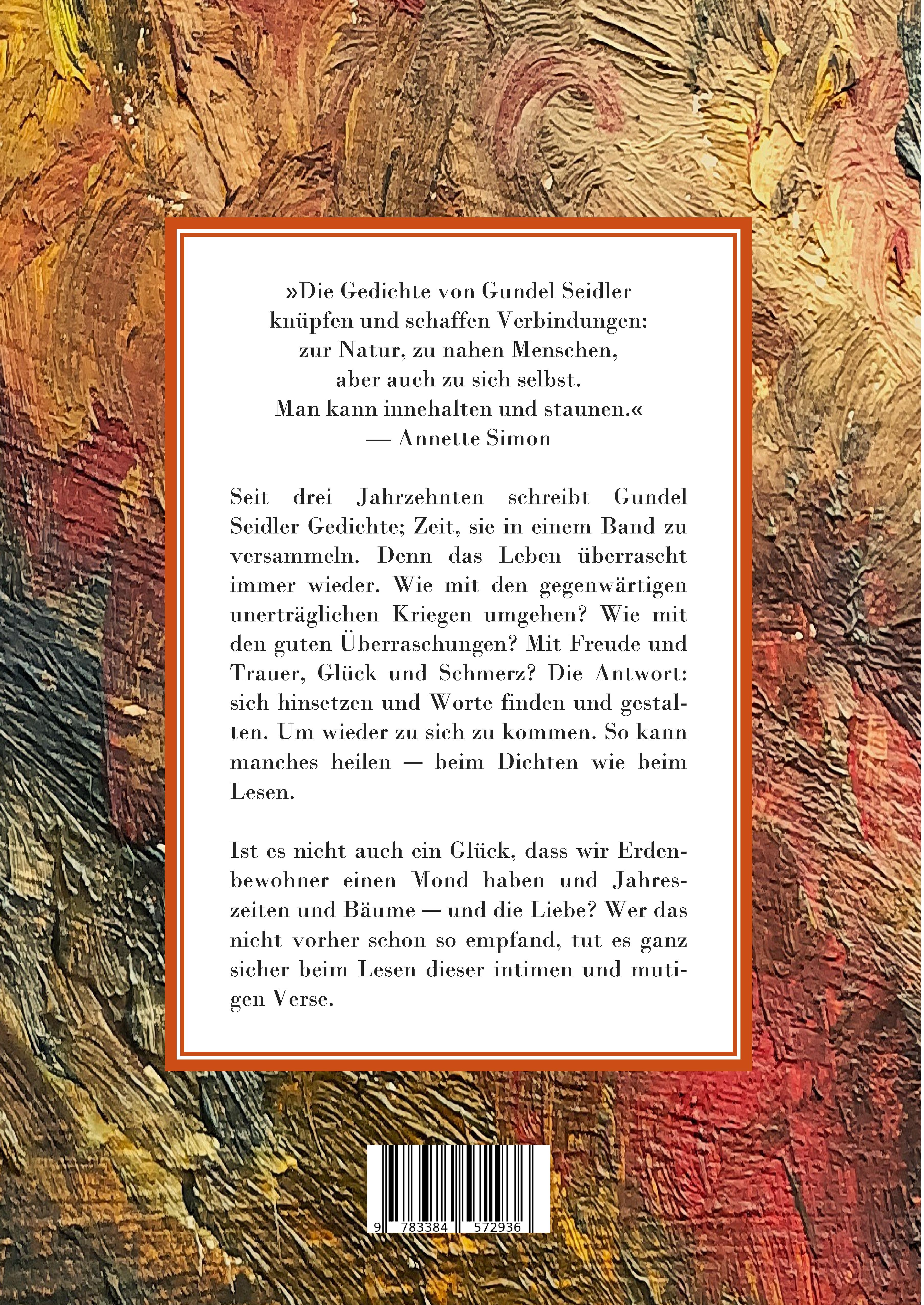 Es ist eine Sammlung von Gedichten, die in dreißig Jahren entstanden sind und die Welt spiegeln. Es gibt Liebesgedichte und Gedichte über die Schönheit der Welt: Dass wir Erdenbewohner einen Mond haben und Jahreszeiten und Bäume, ist doch ein Glück! Noch größer aber ist das Glück, dass wir Liebe empfinden können - nein, müssen, wenn wir leben wollen. Wir brauchen sie wie die Luft zum Atmen. Denn die Welt ist, wie sie ist. Es ist aber ein Unterschied, ob wir sie in Liebe sehen oder nicht - und wie wir sie beschreiben: Wie mit den gegenwärtigen unerträglichen Kriegen umgehen? Wie mit den guten Überraschungen? Mit Freude und Trauer, gebrochenem Glück und tiefem Schmerz? Sich hinsetzen und Worte finden und gestalten. Um wieder zu sich zu kommen. So kann manches heilen - beim Dichten und beim Lesen.