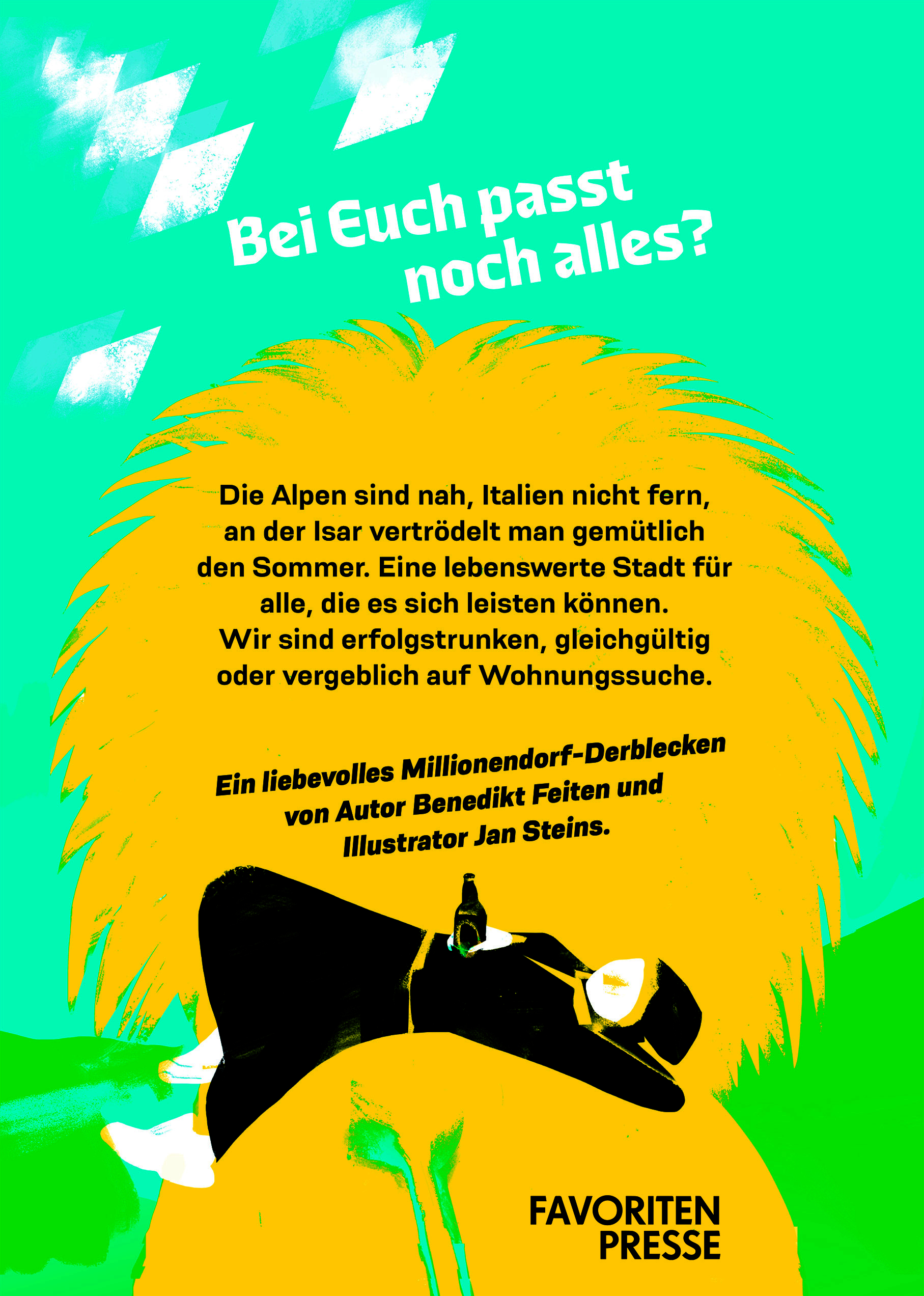 Jan Steins lebt seit 13 Jahren in der Maxvorstadt und kennt den Widerspruch zwischen der viel gerühmten Lebensqualität Münchens – und der knallharten Verdrängung aus Wohn- und Atelierräumen. Neben seiner Arbeit als Illustrator engagiert er sich für bezahlbare Atelier-Mieten und musste gerade das München-Klischee am eigenen Leib erfahren: Das Wohnhaus, in dem er lebt, ging an einen Immobilien-Investor. Schau ma moi. In München wurde er als Saupreiß (und Ossi) erstaunlich gut aufgenommen und illustriert am liebsten für Zeitschriften- und Buchverlage, Musik-Labels, Museen, Gewerkschaften, Kulturvereine und NGOs.