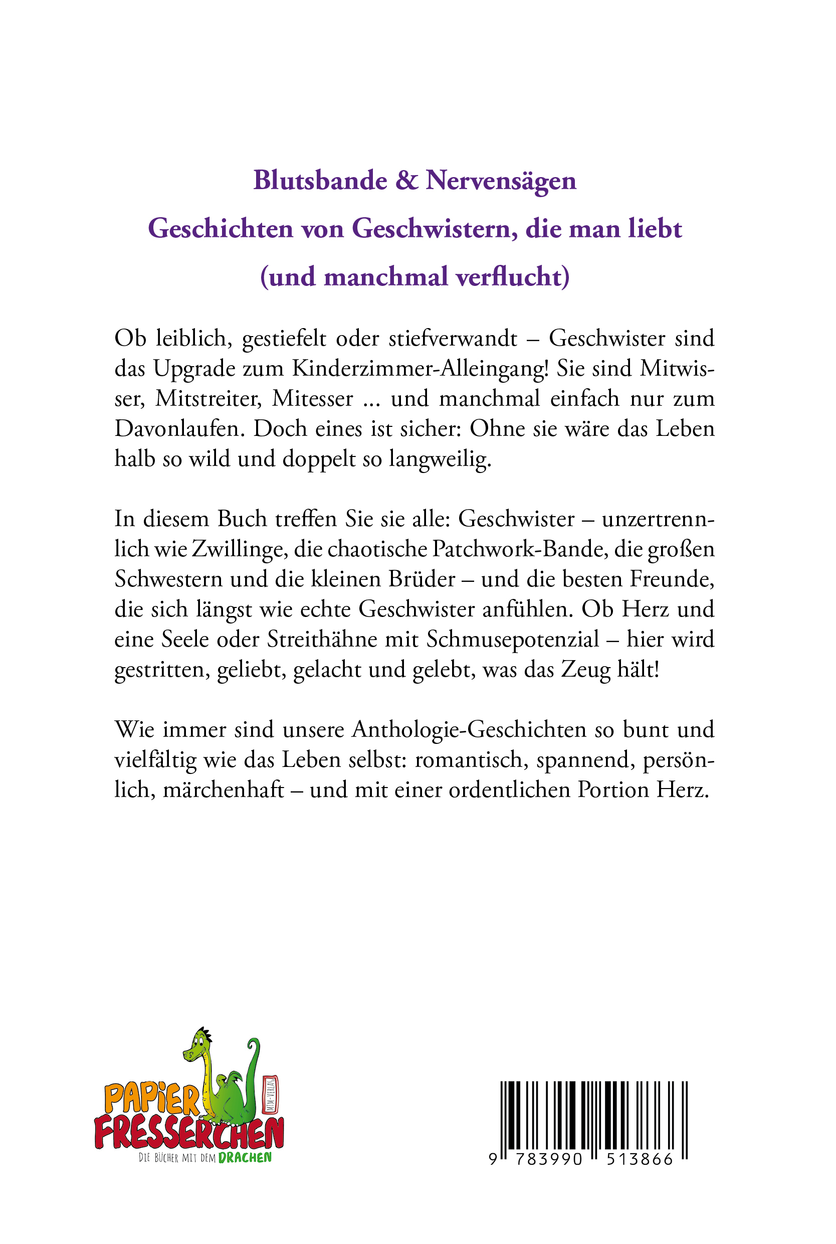 Blutsbande & Nervensägen - Geschichten von Geschwistern, die man liebt (und manchmal verflucht)Ob leiblich, gestiefelt oder stiefverwandt - Geschwister sind das Upgrade zum Kinderzimmer-Alleingang! Sie sind Mitwisser, Mitstreiter, Mitesser ... und manchmal einfach nur zum Davonlaufen. Doch eines ist sicher: Ohne sie wäre das Leben halb so wild und doppelt so langweilig.In diesem Buch treffen Sie sie alle: Geschwister - unzertrennlich wie Zwillinge, die chaotische Patchwork-Bande, die großen Schwestern und die kleinen Brüder - und die besten Freunde, die sich längst wie echte Geschwister anfühlen. Ob Herz und eine Seele oder Streithähne mit Schmusepotenzial - hier wird gestritten, geliebt, gelacht und gelebt, was das Zeug hält!Wie immer sind unsere Anthologie-Geschichten so bunt und vielfältig wie das Leben selbst: romantisch, spannend, persönlich, märchenhaft - und mit einer ordentlichen Portion Herz.