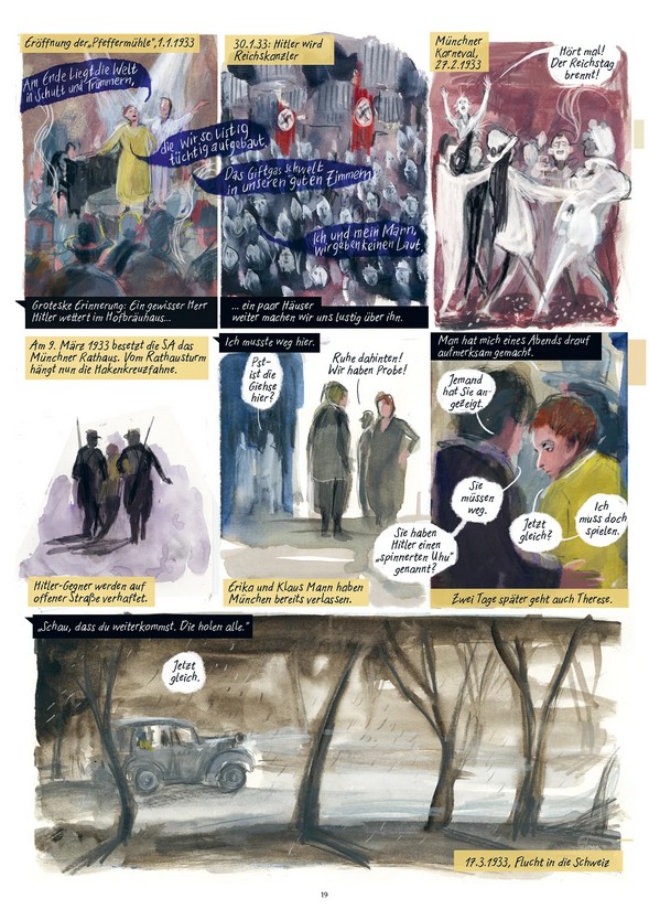 Mit lebendigem, mal suchendem, mal plakativem Strich und nuancierten Farben, vielstimmig in Dialogen, Selbstzeugnissen, Erzähltexten, nähert sich die Comiczeichnerin Barbara Yelin der Schauspielerin Therese Giehse an und schafft ein Comicerlebnis, das an die Unmittelbarkeit eines Bühnenstücks anknüpft.