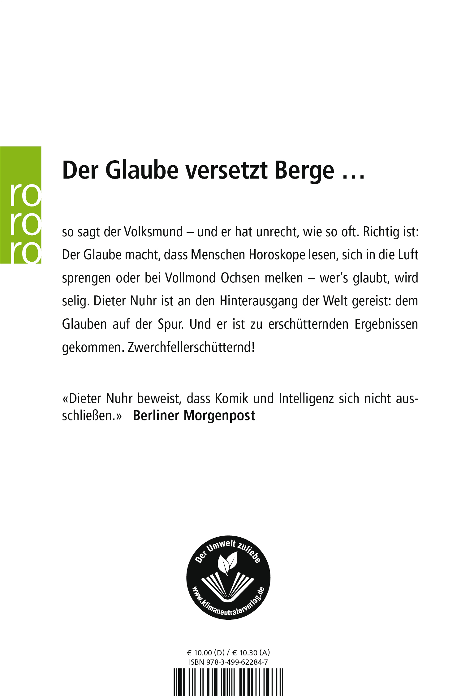 so sagt der Volksmund - und er hat unrecht, wie so oft. Richtig ist: Der Glaube macht, dass Menschen Horoskope lesen, sich in die Luft sprengen oder bei Vollmond Ochsen melken - wer's glaubt, wird selig. Dieter Nuhr ist an den Hinterausgang der Welt gereist: dem Glauben auf der Spur. Und er ist zu erschütternden Ergebnissen gekommen. Zwerchfellerschütternd!