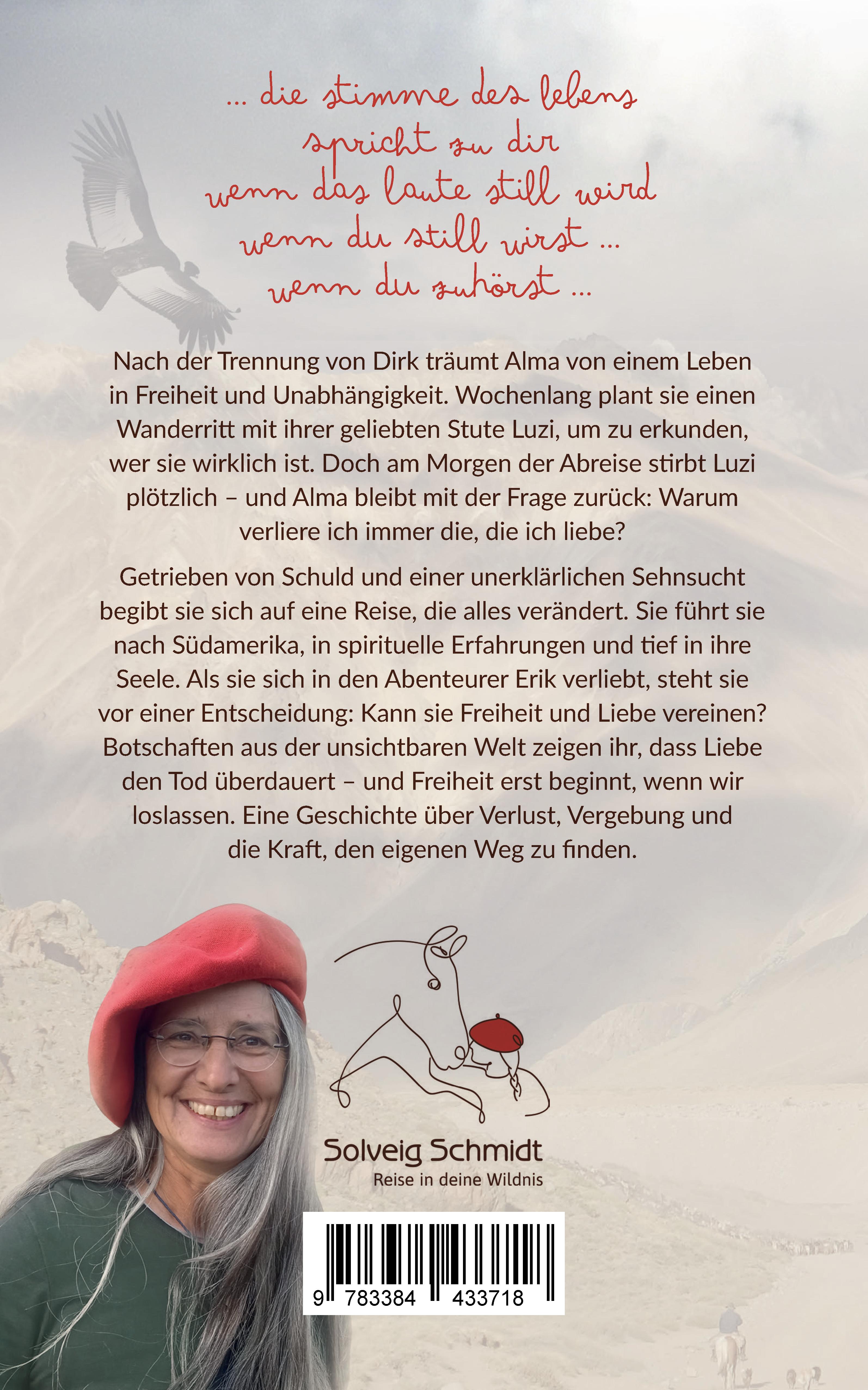 Solveig Schmidt ist Abenteurerin, Autorin und intuitive Mentorin. Sie lebt vor, dass es nie zu spät ist, das eigene Leben neu zu gestalten. Erst mit über 40 lernte sie reiten und hat seitdem über 9000 Kilometer mit ihren Pferden durch die Anden zurückgelegt. Seit 2014 ist sie regelmäßig in Südamerika unterwegs, wo sie in der Weite der Natur und in der Verbundenheit mit Pachamama neue Perspektiven fand. Mit Mitte 50 wagte sie den mutigen Schritt, ihre Festanstellung zu kündigen, um ein Leben zu führen, das ihrer tiefsten Wahrheit entspricht. Heute begleitet sie Frauen, die an einer Schwelle stehen - in Workshops und Heldenreisen mit Pferden, online und offline. Ihr Ziel ist es, Frauen zu ermutigen, sich von alten Mustern zu befreien und endlich das Leben zu leben, das sie sich wirklich wünschen. Solveig hat es sich zur Aufgabe gemacht, durch ihre Worte und Erfahrungen Brücken zu bauen: zwischen der sichtbaren und der spirituellen Welt, zwischen Schmerz und Heilung, zwischen Freiheit und Verantwortung. Ihre Romane und Geschichten sind Einladungen, den eigenen Weg zu finden und alte Wunden loszulassen. Wenn sie nicht schreibt, findet man sie mit ihren Pferden unter dem weiten Himmel Patagoniens oder im Austausch mit Menschen, die ebenso das Niemandsland zwischen innerer Wildnis und äußerer Freiheit durchstreifen. Die Einfachheit des Lebens und die Weisheit der Gauchos in Patagonien sowie Pferde inspirieren sie tief. Diese Erfahrungen teilt sie in ihrer Arbeit. Solveig Schmidt verkörpert Freiheit, Mut und die Kraft, Brücken zu schlagen – zwischen der sichtbaren und unsichtbaren Welt, zwischen Wildnis und Zivilisation, zwischen Verstand und Seele.