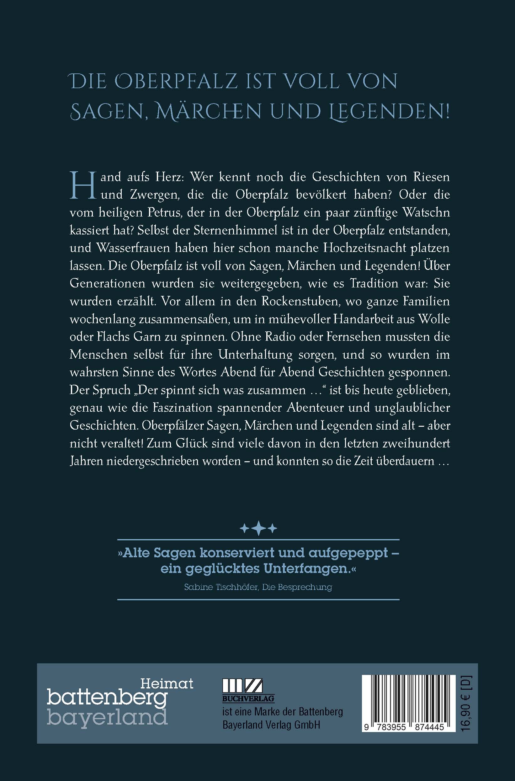 Hand aufs Herz: Wer kennt noch die Geschichten von Riesen und Zwergen, die die Oberpfalz bevölkert haben? Oder die vom heiligen Petrus, der in der Oberpfalz ein paar zünftige Watschn kassiert hat? Selbst der Sternenhimmel ist in der Oberpfalz entstanden und Wasserfrauen haben hier schon manche Hochzeitsnacht platzen lassen. Die Oberpfalz ist voll von Sagen, Märchen und Legenden! Über Generationen wurden sie weitergegeben, wie es Tradition war: Sie wurden erzählt. Vor allem in den Rockenstuben, wo ganze Familien wochenlang zusammensaßen, um in mühevoller Handarbeit aus Wolle oder Flachs Garn zu spinnen. Ohne Radio oder Fernsehen mussten die Menschen selbst für ihre Unterhaltung sorgen, und so wurden im wahrsten Sinne des Wortes Abend für Abend Geschichten gesponnen. Der Spruch "Der spinnt sich was zusammen ..." ist bis heute geblieben, genau wie die Faszination spannender Abenteuer und unglaublicher Geschichten. Oberpfälzer Sagen, Märchen und Legenden sind alt - aber nicht veraltet! Zum Glück sind viele Sagen, Märchen und Legenden in den letzten zweihundert Jahren niedergeschrieben worden - und konnten so die Zeit überdauern ...