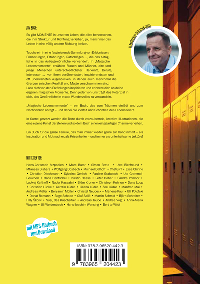 In Magische Lebensmomente erzählen 43 Persönlichkeiten – Prominente und Menschen jenseits des Rampenlichts – von berührenden, inspirierenden und oft unerwarteten Augenblicken. Ihre wahren Lebensgeschichten laden zum Träumen ein, regen zum Nachdenken an und zeigen, wie Erfahrungen uns prägen und neue Wege eröffnen. Manchmal verschwimmen in den Erlebnissen und Erinnerungen die Grenzen zwischen Realität und Magie, immer wird die Vielfalt und Schönheit des Lebens gefeiert. In Szene gesetzt werden die Texte durch verzaubernde Illustrationen, die dem Werk einen einzigartigen Charme verleihen.