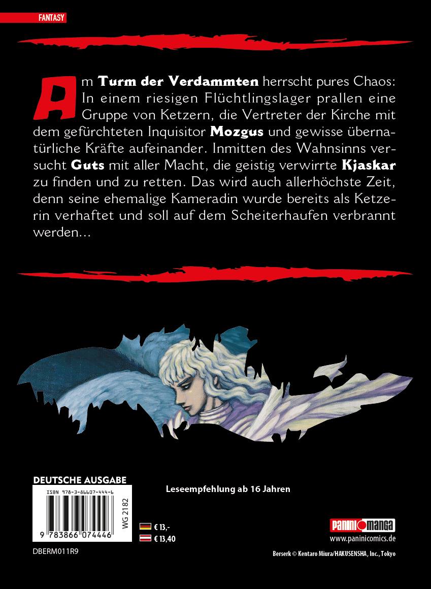 BERSERK MAX 11Am Turm der Verdammten herrscht pures Chaos: In einem riesigen Flüchtlingslager prallen eine Gruppe von Ketzern, die Vertreter der Kirche mit dem gefürchteten Inquisitor Mozgus und gewisse übernatürliche Kräfte aufeinander. Inmitten des Wahnsinns versucht Guts mit aller Macht, die geistig verwirrte Kjaskar zu finden und zu retten. Das wird auch allerhöchste Zeit, denn die ehemalige Kameradin wurde bereits als Ketzerin verhaftet und droht, auf dem Scheiterhaufen verbrannt zu werden.