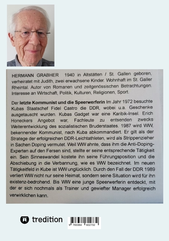 HERMANN GRABHER, * 1940 in Altstätten (St.Gallen) Schweiz, verheiratet seit mehr als 50 Jahren, 2 erwachsene Kinder, wohnhaft im St.Galler Rheintal. Bis 1990 kaufmännischer Leiter der familieneigenen Firma für Maschinenbau (gegründet 1936 von seinem Vater), vorwiegend Export orientiert. 1991 Veräusserung seines Besitzanteils an seinen Bruder und Firmenaustritt. Ab 1991 freier Berater im Finanzbereich. Berufsbedingt intensive Reisetätigkeit weltweit . Interessiert an eigenen und fremden Kulturen, wie auch an der eigenen und an fremden Religionen. Wirtschaftsbewandert. Sportbegeistert.