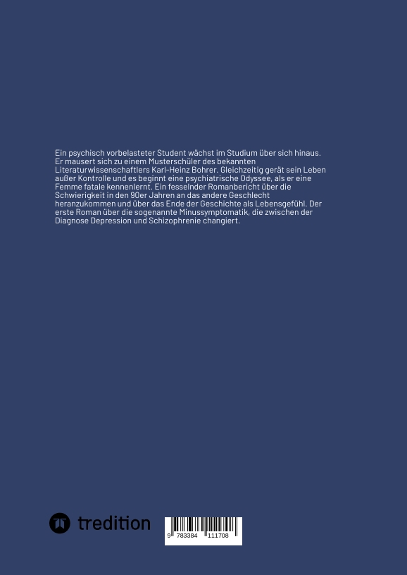 Ein psychisch vorbelasteter Student wächst im Studium über sich hinaus. Er mausert sich zu einem Musterschüler eines bedeutenden Professors für Literaturwissenschaften in Bielefeld. Gleichzeitig gerät sein Leben aus der Kontrolle und es folgt eine psychiatrische Odyssee, als er eine Femme fatale kennenlernt. Ein fesselnder Romanbericht, nicht nur über Schizophrenie und Depression, sondern auch eine Dokumentation über die Schwierigkeit in den 90er Jahren ans andere Geschlecht zu kommen und über das Ende der Geschichte als Lebensgefühl. Der erste Roman über eine schizophrene Minussymptomatik.