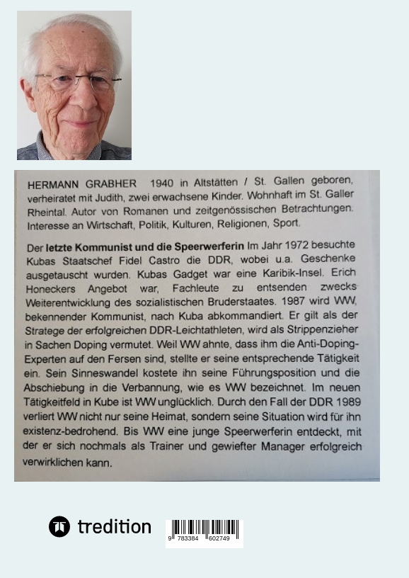 HERMANN GRABHER, * 1940 in Altstätten (St.Gallen) Schweiz, verheiratet seit mehr als 50 Jahren, 2 erwachsene Kinder, wohnhaft im St.Galler Rheintal. Bis 1990 kaufmännischer Leiter der familieneigenen Firma für Maschinenbau (gegründet 1936 von seinem Vater), vorwiegend Export orientiert. 1991 Veräusserung seines Besitzanteils an seinen Bruder und Firmenaustritt. Ab 1991 freier Berater im Finanzbereich. Berufsbedingt intensive Reisetätigkeit weltweit . Interessiert an eigenen und fremden Kulturen, wie auch an der eigenen und an fremden Religionen. Wirtschaftsbewandert. Sportbegeistert.