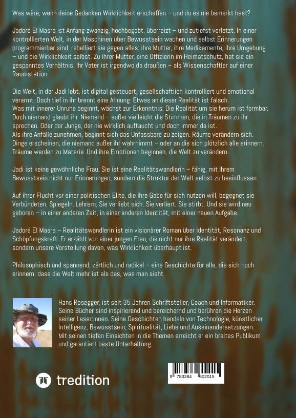 Hans Rosegger geb. 1953, ist Schriftsteller, Informatiker und Coach. Er arbeitete zunächst als Ingenieur in der Elektronikindustrie. Seit über 35 Jahren ist er nun als Coach/Hypnotherapeut tätig. Seine Bücher sind inspirierend und bereichernd. Sie behandeln eine Vielzahl von Themen wie Technologie, künstliche Intelligenz, Bewusstsein und Spiritualität. Mit seinen tiefen Einsichten und seiner Fähigkeit, komplexe Ideen verständlich zu vermitteln, erreicht er ein breites Publikum und berührt die Herzen seiner Leserinnen und Leser. Neben seinen Romanen, hat er mehrere Bücher zu den Themen Meditation und Bewusstsein verfasst. Doch seine große Liebe gilt dem Roman. In seinen Romanen erweckt er die phantastischen Erfahrungen der Hypnosetrancen und der meditativen Lebensweise zum Leben. Er entführt den Leser in die surrealen Welten des Geistes. Der Alltag wird in seinen Geschichten zum Spielraum unglaublicher Ereignisse und erweitert sich in die phantastischen Welten jenseits der üblichen Vorstellungen. In seinen Romanen lösen sich die Grenzen von Wissenschaft und Spiritualität auf und verschmelzen zu einem menschlichen Kontinuum ungeahnter Größe.