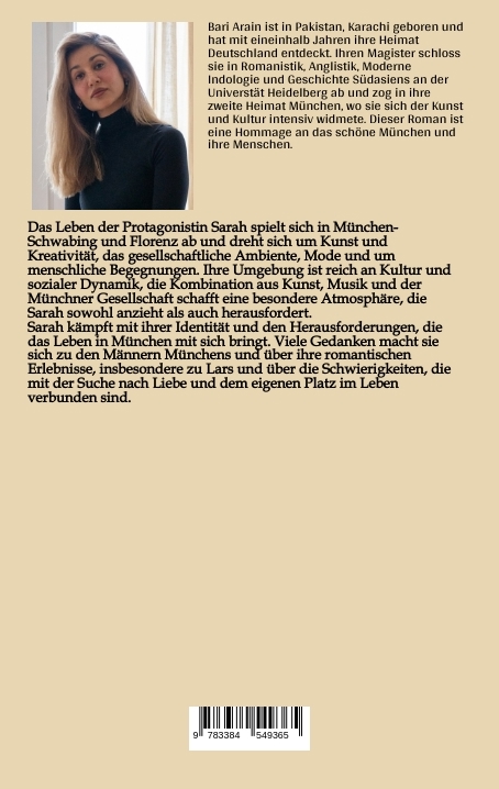 Bari Arain wurde in Pakistan, Karachi geboren und hat mit eineinhalb Jahren ihre Heimat Deutschland entdeckt. Ihren Magister schloss sie in Romanistik, Anglistik, Moderne Indologie und Geschichte Südasiens an der Universtät Heidelberg ab und zog in ihre zweite Heimat München, wo sie sich der Kunst und Kultur intensiv widmete. Dieser Roman ist eine Hommage an das schöne München und ihre Menschen.