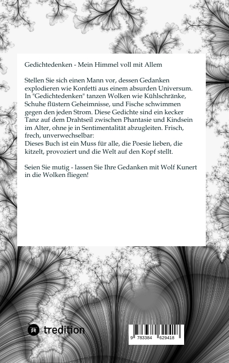 | Schlagworte | absurde Gedichte • absurde lyrik • Absurde Poesie • Gedichtband • Gedichte • Gedichtedenken • humorvolle Gedichte • humorvolle poesie • Kreative Gedichte • lyrische Gedankenspiele • Moderne Gedichte • Moderne Lyrik • Moderne Poesie • poetische Gedankenspiele • unkonventionelle Poesie |