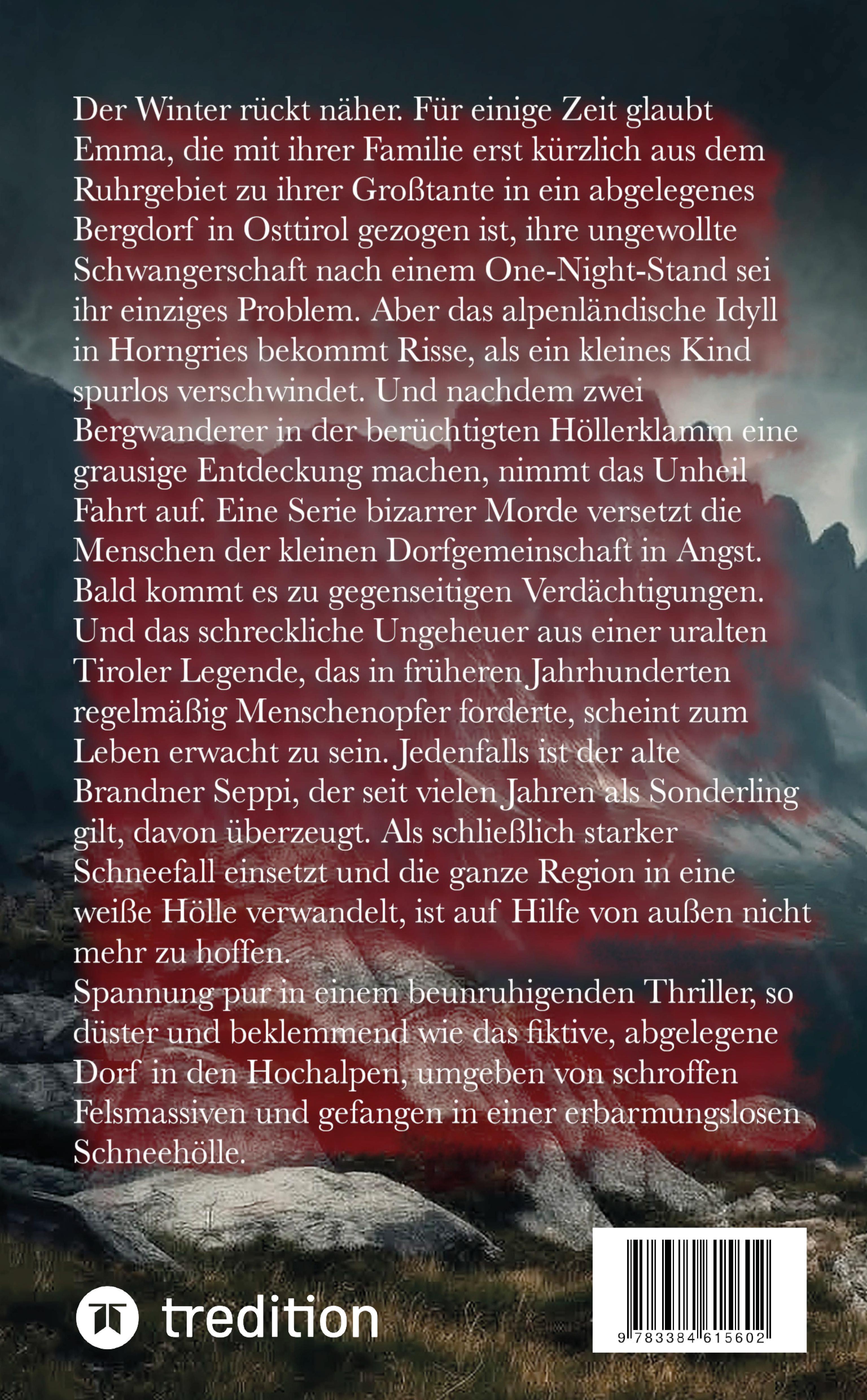 Der Winter rückt näher. Für einige Zeit glaubt Emma, die mit ihrer Familie erst kürzlich aus dem Ruhrgebiet zu ihrer Großtante in ein abgelegenes Bergdorf in Osttirol gezogen ist, ihre ungewollte Schwangerschaft nach einem One-Night-Stand sei ihr einziges Problem. Aber das alpenländische Idyll in Horngries bekommt Risse, als ein kleines Kind spurlos verschwindet. Und nachdem zwei Bergwanderer in der berüchtigten Höllerklamm eine grausige Entdeckung machen, nimmt das Unheil Fahrt auf. Eine Serie bizarrer Morde versetzt die Menschen der kleinen Dorfgemeinschaft in Angst. Bald kommt es zu gegenseitigen Verdächtigungen. Und das schreckliche Ungeheuer aus einer uralten Tiroler Legende, das in früheren Jahrhunderten regelmäßig Menschenopfer forderte, scheint zum Leben erwacht zu sein. Jedenfalls ist der alte Brandner Seppi, der seit vielen Jahren als Sonderling gilt, davon überzeugt. Als schließlich starker Schneefall einsetzt und die ganze Region in eine weiße Hölle verwandelt, ist auf Hilfe von außen nicht mehr zu hoffen. Spannung pur in einem beunruhigenden Thriller, so düster und beklemmend wie das fiktive, abgelegene Dorf in den Hochalpen, umgeben von schroffen Felsmassiven und gefangen in einer erbarmungslosen Schneehölle.