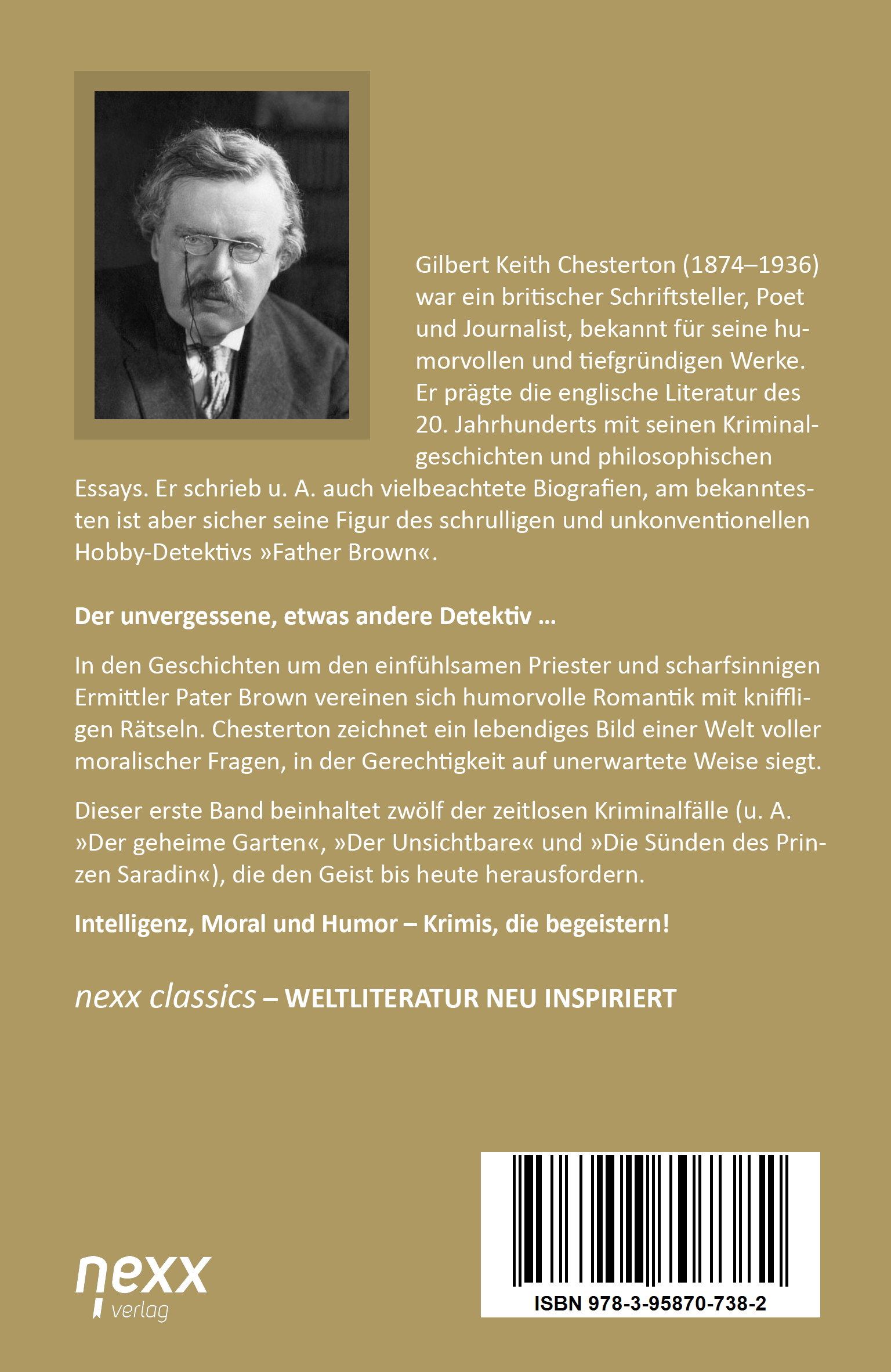 Gilbert Keith Chesterton (1874–1936) war ein britischer Schriftsteller, Poet und Journalist, bekannt für seine humorvollen und tiefgründigen Werke. Er prägte die englische Literatur des 20. Jahrhunderts mit seinen Kriminalgeschichten und philosophischen Essays. Er schrieb u. A. auch vielbeachtete Biografien, am bekanntesten ist aber sicher seine Figur des schrulligen und unkonventionellen Hobby-Detektivs »Father Brown«.