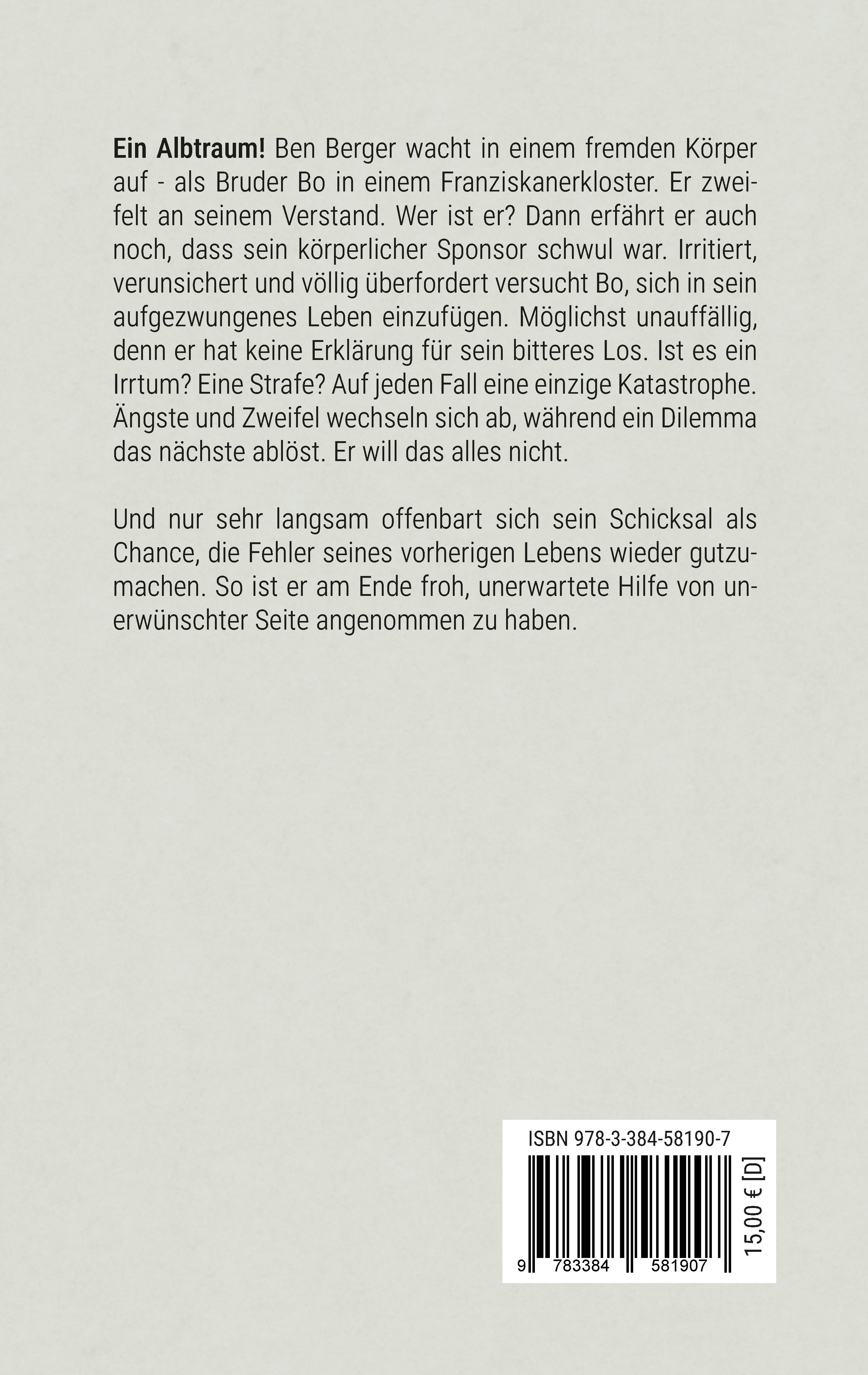 Ein Albtraum! Ben Berger wacht in einem fremden Körper auf - als Bruder Bo in einem Franziskanerkloster. Er zweifelt an seinem Verstand. Wer ist er überhaupt? Und wie ist er an diesen Ort gekommen? Ohne Näheres zu wissen, kann er sich kaum jemandem offenbaren, den er nicht kennt. Doch wie fügt man sich als Fremdling unauffällig in ein Klosterleben ein, ohne die geringste Ahnung vom Alltag der Mönche zu haben. Schlimmer noch, ohne selbst ein gläubiger Mensch zu sein, zumindest weiß er nichts davon. Dann erfährt er auch noch, dass sein körperlicher Sponsor schwul war. Irritiert, verunsichert und völlig überfordert versucht Bo, sich in sein aufgezwungenes Leben einzufügen. Er fühlt sich wie ein Alien, dessen Identität unerkannt bleiben muss. Lange Zeit auch für ihn selbst, denn er hat keine Erklärung für sein bitteres Los. Ist es ein Irrtum? Eine Strafe? Auf jeden Fall eine einzige Katastrophe. Ängste und Zweifel wechseln sich ab, während ein Dilemma das nächste ablöst. Um seine missliche Lage noch zu vergrößern, lernt er auch noch eine Frau kennen, die ihn fasziniert. Er will das alles nicht. Und nur sehr langsam offenbart sich sein Schicksal als Chance, die Fehler seines vorherigen Lebens wieder gutzumachen. So ist er am Ende froh, unerwartete Hilfe von unerwünschter Seite angenommen zu haben.