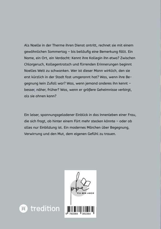 Als Noelle in der Therme ihren Dienst antritt, rechnet sie mit einem gewöhnlichen Sommertag - bis beiläufig eine Bemerkung fällt. Ein Name, ein Ort, ein Verdacht: Kennt ihre Kollegin ihn etwa? Zwischen Chlorgeruch, Kollegentratsch und flirrenden Erinnerungen beginnt Noelles Welt zu schwanken. Wer ist dieser Mann wirklich, den sie erst kürzlich in der Stadt fast umgerannt hat? Was, wenn ihre Begegnung kein Zufall war? Was, wenn jemand anderes ihn kennt - besser, näher, früher? Was, wenn er größere Geheimnisse verbirgt, als sie ahnen kann?Ein leiser, spannungsgeladener Einblick in das Innenleben einer Frau, die sich fragt, ob hinter einem Flirt mehr stecken könnte - oder ob alles nur Einbildung ist. Ein modernes Märchen über Begegnung, Verwirrung und den Mut, dem eigenen Gefühl zu trauen.