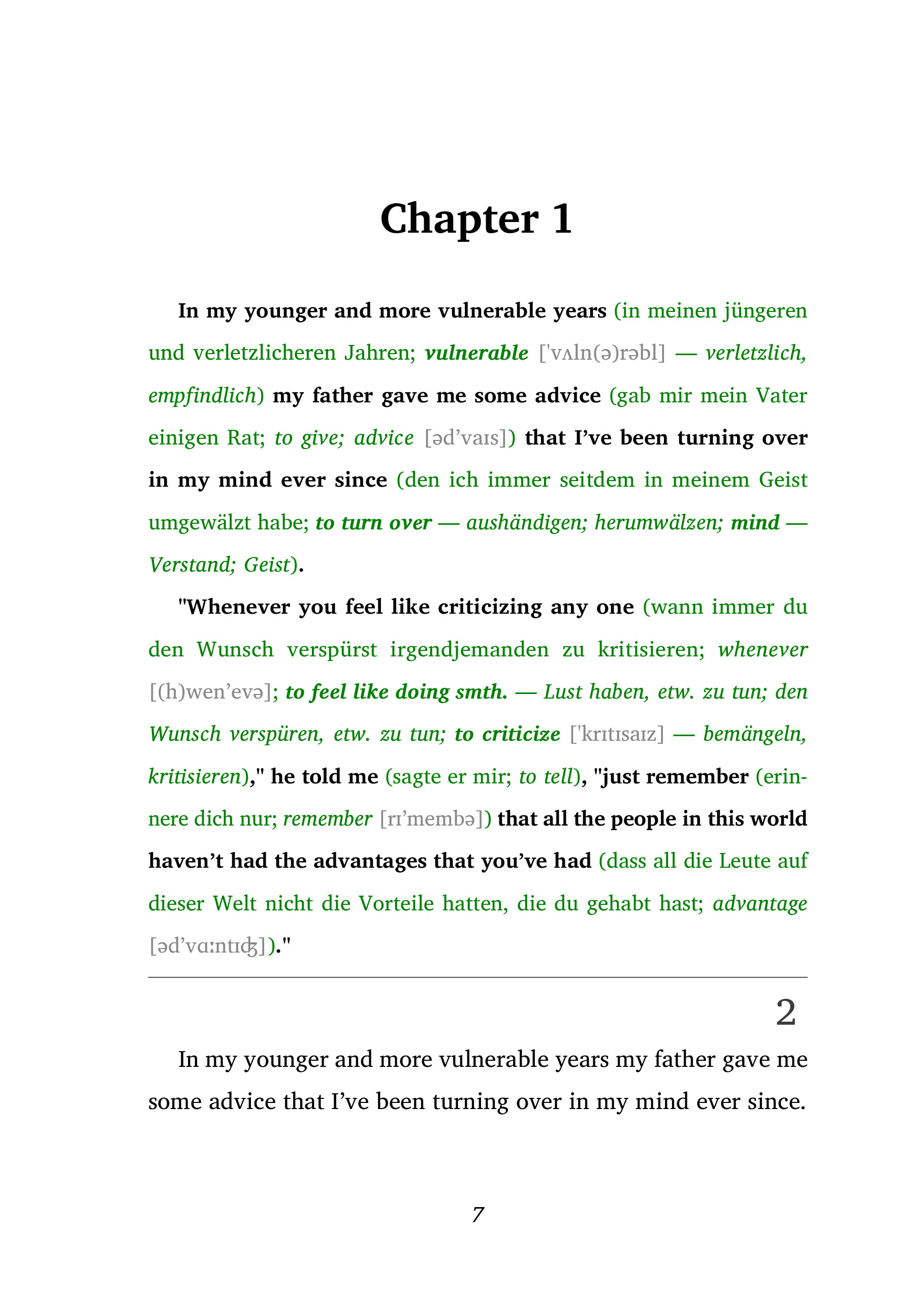 The Great Gatsby - Ein moderner Klassiker mit der Frank-Lesemethode (B1-B2)Originaltext. Ungekürzt. Verständlich. Frank-Lesemethode.Erleben Sie die Goldenen Zwanziger mit all ihrem Glanz, ihrer Sehnsucht - und ihrer Leere. The Great Gatsby von F. Scott Fitzgerald gilt als einer der bedeutendsten Romane der amerikanischen Literatur. Diese Ausgabe enthält den vollständigen Originaltext - authentisch und ungekürzt, aber durch die Frank-Lesemethode auch für fortgeschrittene Englischlernende verständlich gemacht.Die Frank-Lesemethode bietet eine einzigartige Möglichkeit, literarische Werke im Original zu lesen - mit sofort verständlichen Übersetzungen und klaren Erklärungen direkt im Text. Ohne Vokabellisten. Ohne ständiges Nachschlagen. So vertiefen Sie Ihre Sprachkenntnisse auf B1-B2-Niveau - und genießen dabei echte Weltliteratur.Tauchen Sie ein in die geheimnisvolle Welt von Jay Gatsby, der für eine verlorene Liebe alles riskiert. The Great Gatsby ist nicht nur eine Geschichte über Reichtum und Illusionen, sondern auch eine Reflexion über Träume, Gesellschaft und den amerikanischen Traum.Für alle, die ihre Englischkenntnisse erweitern und dabei ein Meisterwerk der Weltliteratur erleben möchten.Inklusive kostenlosem Hörbuch zum Mitlesen und Trainieren des Hörverstehens.Leseprobe: https://easyoriginal.com/leseproben/DE53.pdf