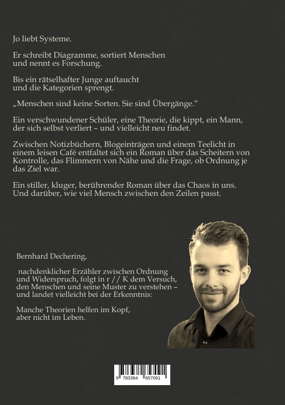 Bernhard Dechering beobachtet. Schon immer. Menschen, Gespräche, das, was zwischen den Zeilen passiert – oder eben nicht mehr passiert. Als jemand, der als Bestatter mitten im echten Leben steht, hat er ein feines Gespür für das, was oft übersehen wird: das Verstummen im Lärm, das Alleinsein im Getümmel, die Leere hinter der perfekten Fassade. Mit "Der Spiegel im Käfig" veröffentlichte er sein erstes Werk – eine literarische Momentaufnahme unserer Zeit, inspiriert vom realen Leben und dem beunruhigenden Gedanken, dass Überfluss nicht rettet, sondern lähmt. Sein zweiter Roman "r//K - Der Versuch von Ordnung" geht noch einen Schritt weiter: Er erzählt von einem Mann, der Menschen in Diagramme fasst, bis ein Junge auftaucht, der sich jeder Kategorie entzieht – und die Theorie zum Einsturz bringt. Es ist ein leiser, poetischer Text über Nähe, Systemkritik und die Frage, ob Ordnung je das Ziel war. Bernhard Dechering schreibt, weil er glaubt, dass Geschichten verändern können. Nicht laut. Sondern leise – da, wo sie wirklich ankommen: im Kopf und unter der Haut.