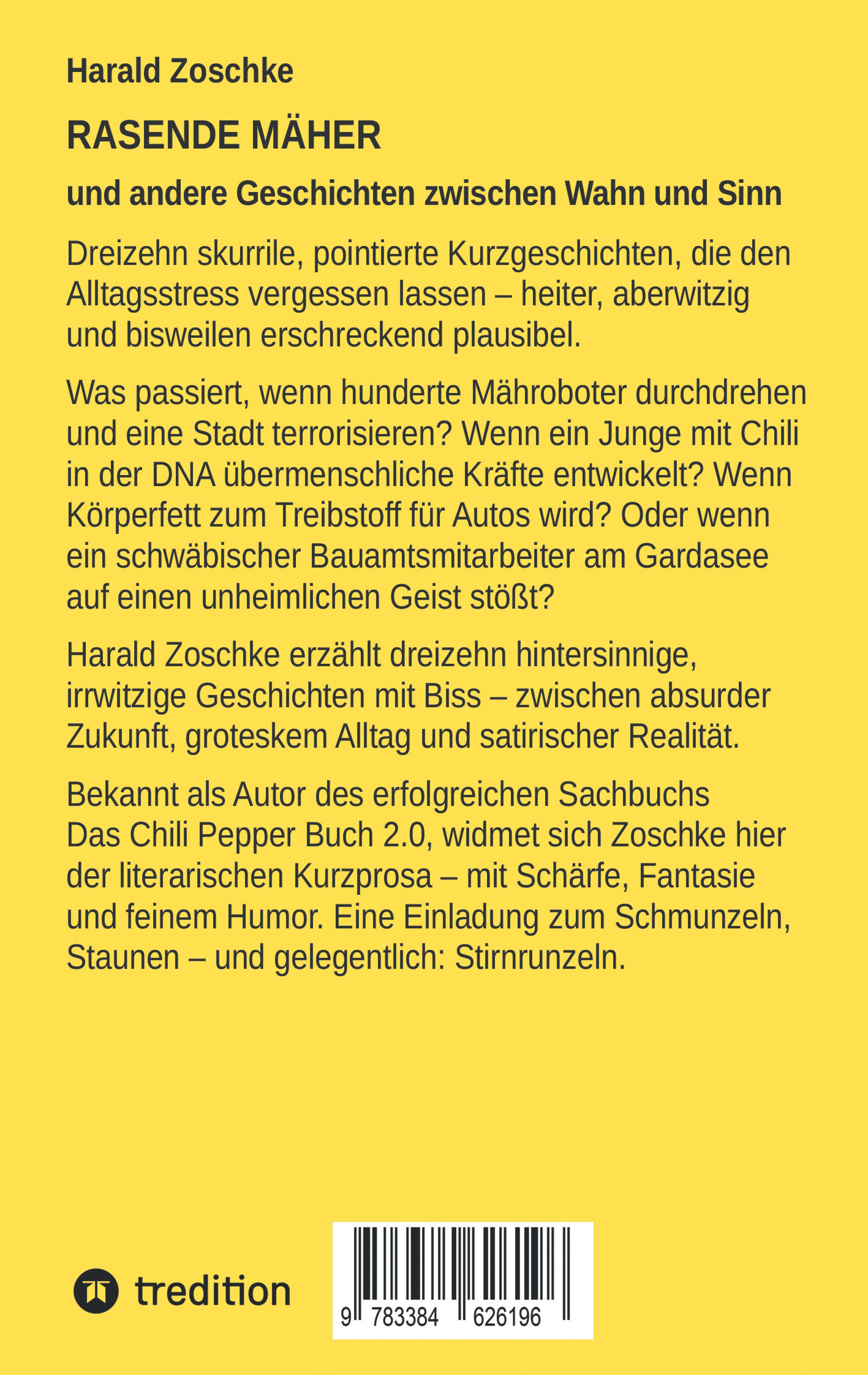 Nach seinem Ingenieur-Studium in Hamburg siedelte Harald Zoschke nach München um, wo er die ersten zwei Jahrzehnte seines Berufslebens in der IT-Branche tätig war. Bereits nach wenigen Jahren gründete er seine eigene Firma mit Schwerpunkt Tools und Bibliotheken für Software-Entwickler. Nach 20 Jahren war es dann Zeit für einen radikalen Wechsel: Aus dem Hobby Anbau und Verwendung von Chilis aus aller Welt wurde eine Geschäftstätigkeit. Der Höhepunkt waren vier Jahre Entwicklung und Vertrieb preisgekrönter Chili-Soßen in den USA, dazu ein eigenes Versand- und Ladengeschäft in Florida, das so ziemlich alles verkaufte, was irgendwie mit den scharfen Schoten zu tun hat. Dieses Konzept brachte Harald dann erfolgreich nach Deutschland. Sein umfassendes Werk „Das Chili Pepper Buch 2.0“ ist inzwischen Standardliteratur für Freunde der feurigen Früchte. Nachdem Harald vor ein paar Jahren seinen scharfen Shop in neue Hände gab, schrieb er weitere Chili-Bücher, von denen eines sogar in italienischer Ausgabe erschien. Während er privat noch immer allerlei Chilis anbaut und damit kocht und grillt, schreibt er jetzt auch über andere Themen, die ihm am Herzen liegen. Wann immer ihm etwas ein- oder auffällt, macht er sich Notizen. So entstand die Kurzgeschichten-Sammlung "Rasende Mäher".