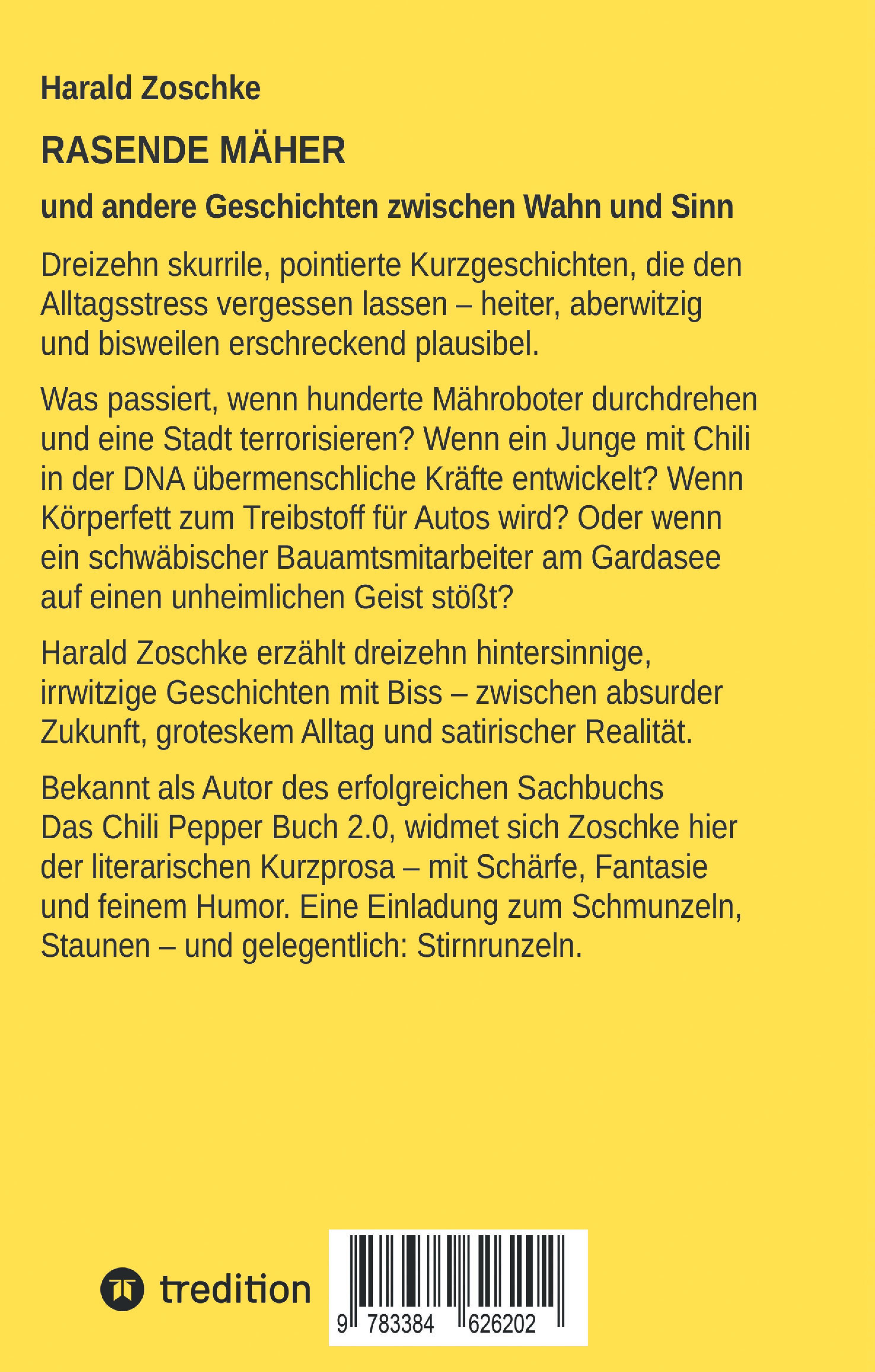 Nach seinem Ingenieur-Studium in Hamburg siedelte Harald Zoschke nach München um, wo er die ersten zwei Jahrzehnte seines Berufslebens in der IT-Branche tätig war. Bereits nach wenigen Jahren gründete er seine eigene Firma mit Schwerpunkt Tools und Bibliotheken für Software-Entwickler. Nach 20 Jahren war es dann Zeit für einen radikalen Wechsel: Aus dem Hobby Anbau und Verwendung von Chilis aus aller Welt wurde eine Geschäftstätigkeit. Der Höhepunkt waren vier Jahre Entwicklung und Vertrieb preisgekrönter Chili-Soßen in den USA, dazu ein eigenes Versand- und Ladengeschäft in Florida, das so ziemlich alles verkaufte, was irgendwie mit den scharfen Schoten zu tun hat. Dieses Konzept brachte Harald dann erfolgreich nach Deutschland. Sein umfassendes Werk „Das Chili Pepper Buch 2.0“ ist inzwischen Standardliteratur für Freunde der feurigen Früchte. Nachdem Harald vor ein paar Jahren seinen scharfen Shop in neue Hände gab, schrieb er weitere Chili-Bücher, von denen eines sogar in italienischer Ausgabe erschien. Während er privat noch immer allerlei Chilis anbaut und damit kocht und grillt, schreibt er jetzt auch über andere Themen, die ihm am Herzen liegen. Wann immer ihm etwas ein- oder auffällt, macht er sich Notizen. So entstand die Kurzgeschichten-Sammlung "Rasende Mäher".