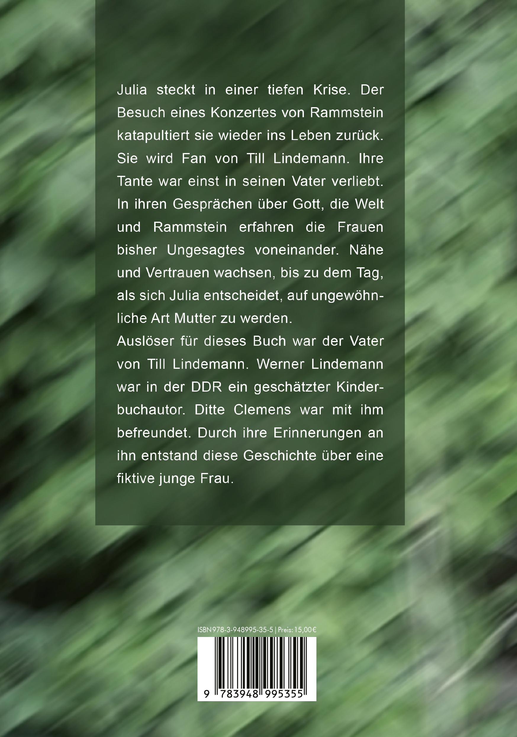 Julia steckt in einer tiefen Krise. Der Besuch eines Konzertes von Rammstein katapultiert sie wieder ins Leben zurück. Sie wird Fan von Till Lindemann. Ihre Tante war einst in seinen Vater verliebt. In ihren Gesprächen über Gott, die Welt und Rammstein erfahren die Frauen bisher Ungesagtes voneinander. Nähe und Vertrauen wachsen, bis zu dem Tag, als sich Julia entscheidet, auf ungewöhnliche Art Mutter zu werden. Auslöser für dieses Buch war der Vater von Till Lindemann. Werner Lindemann war in der DDR ein geschätzter Kinderbuchautor. Ditte Clemens war mit ihm befreundet. Durch ihre Erinnerungen an ihn entstand diese Geschichte über eine fiktive junge Frau.