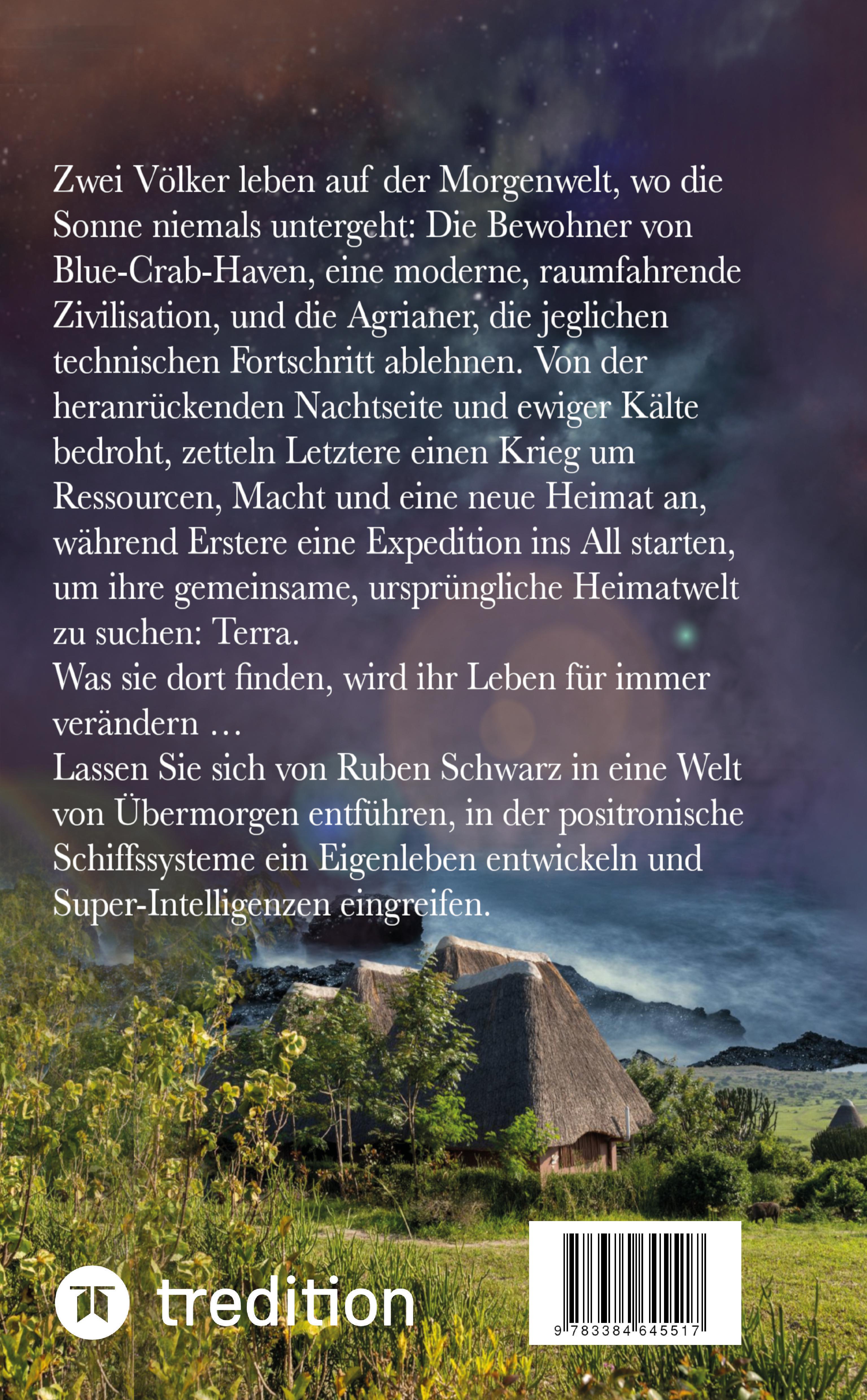 Sie sind Abkömmlinge der Menschheit und bewohnen einen erdähnlichen Himmelskörper in einem fernen Sonnen-System. Dort leben auf der einen Seite die Bewohner von Blue-Crab-Haven, eine moderne raumfahrende Zivilisation, und auf der anderen Seite die Agrianer, die jeglichen technischen Fortschritt ablehnen und beinahe mittelalterliche Strukturen aufrechterhalten. Während Letztere einen Krieg um Macht, Ressourcen und die Erweiterung ihres Territoriums anzetteln, starten die anderen eine Expedition ins All, um ihre gemeinsame Ursprungswelt Terra zu finden. Dort treffen sie auf primitive Waldbewohner und auf uralte Roboter, die seit Jahrhunderten ihren Dienst tun. Als sich holografische Bots, die sogenannten "Helfer", einschalten und das positronische System des Schiffs ein Eigenleben entwickelt, taucht eine geheimnisvolle Super-Intelligenz auf. Mit Heimatwelten entführt Ruben Schwarz die Leserin und den Leser mit einer packenden Story in eine ferne Zukunft und stellt die Frage, ob der Mensch wirklich schon die oberste Sprosse der Evolutionsleiter erreicht hat.