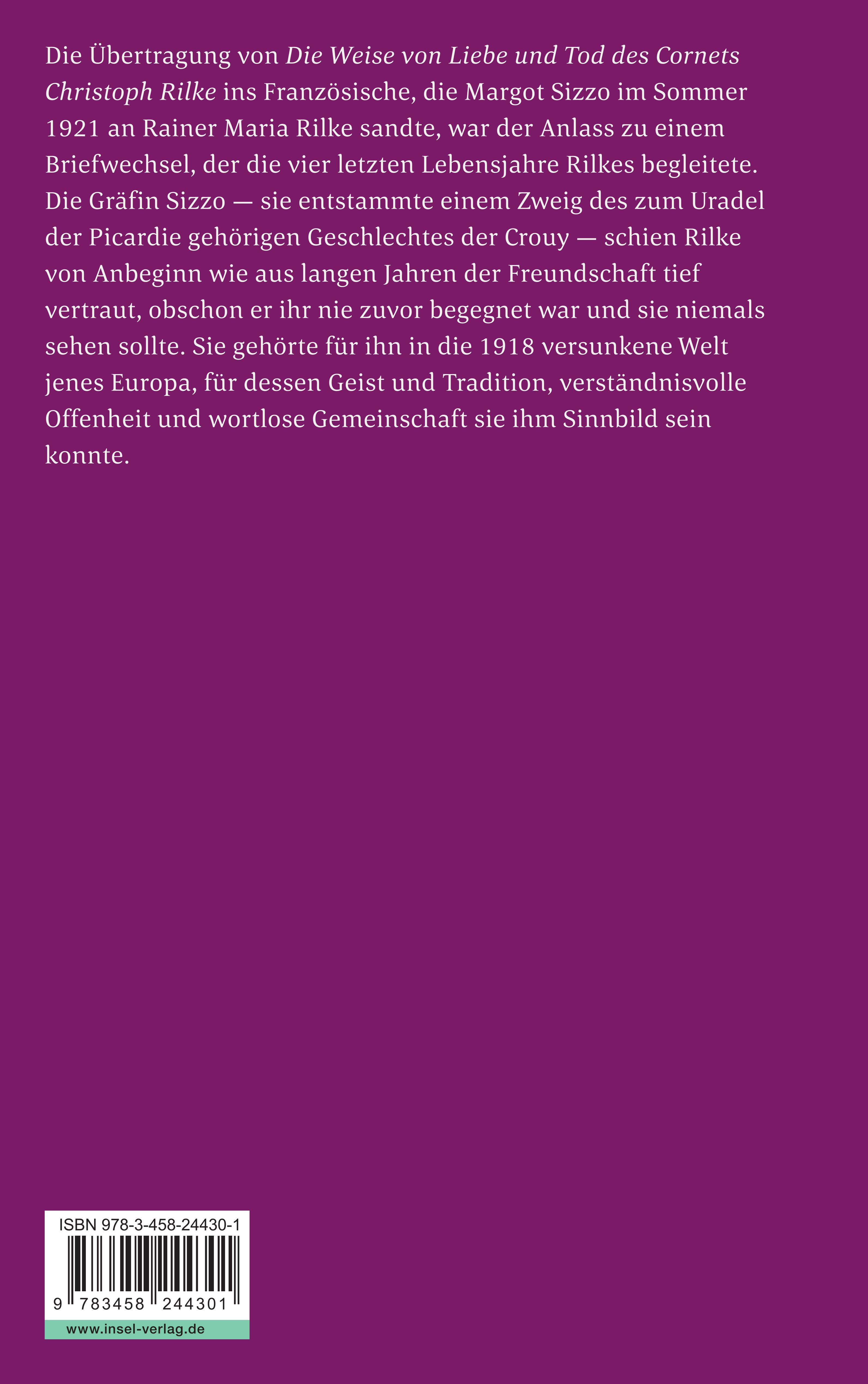 Die Übertragung von Die Weise von Liebe und Tod des Cornets Christoph Rilke ins Französische, die Margot Sizzo im Sommer 1921 an Rainer Maria Rilke sandte, war der Anlass zu einem Briefwechsel, der die vier letzten Lebensjahre Rilkes begleitete. Die Gräfin Sizzo - sie entstammte einem Zweig des zum Uradel der Picardie gehörigen Geschlechtes der Crouy - schien Rilke von Anbeginn wie aus langen Jahren der Freundschaft tief vertraut, obschon er ihr nie zuvor begegnet war und sie niemals sehen sollte. Sie gehörte für ihn in die 1918 versunkene Welt jenes Europa, für dessen Geist und Tradition, verständnisvolle Offenheit und wortlose Gemeinschaft sie ihm Sinnbild sein konnte.