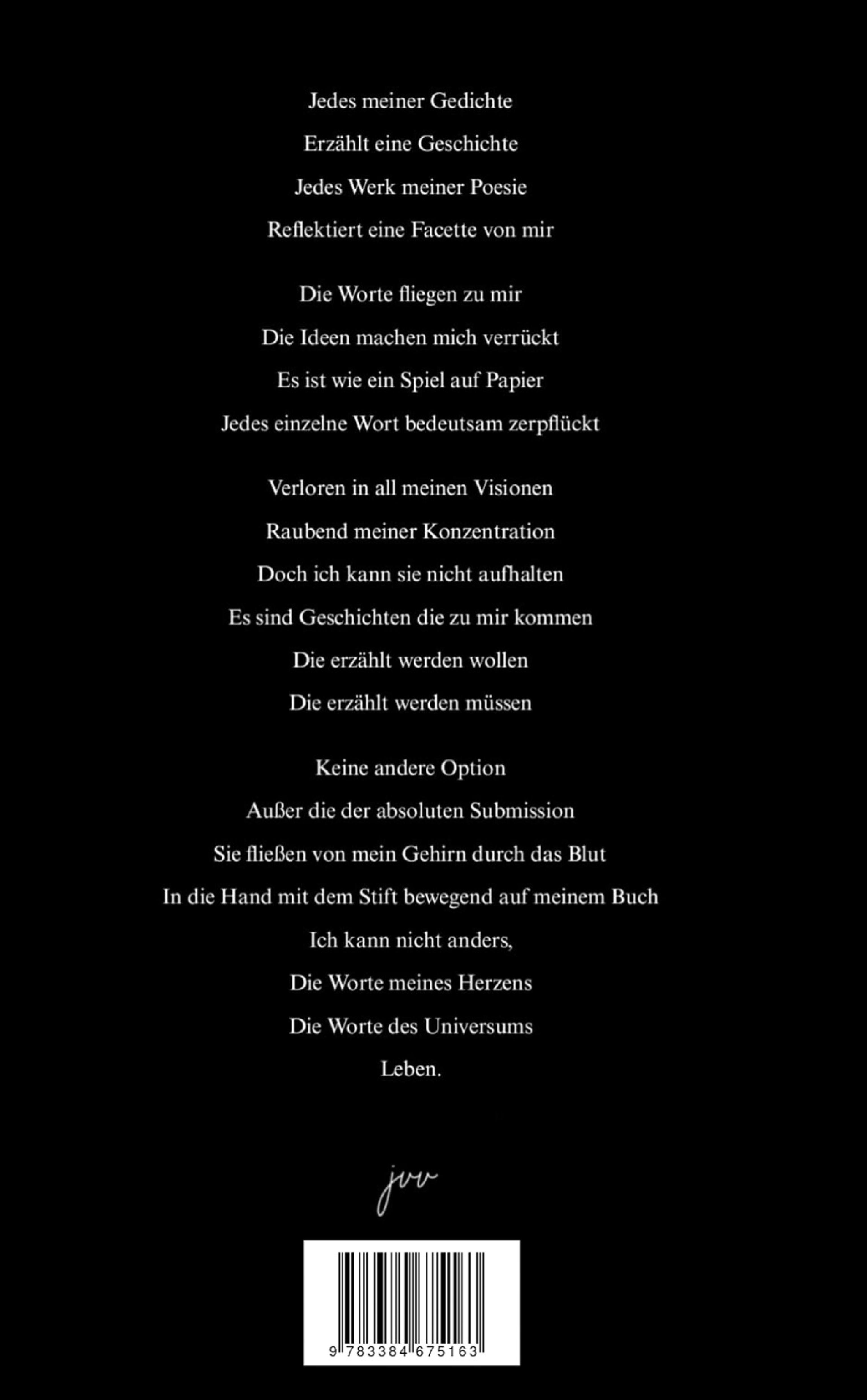 An alle Lesenden und Neugierigen, In euren Händen befindet sich nun eine Kollektion von 136 poetischen Werken (sowohl auf Deutsch als auch auf Englisch), die ich in den letzten 4 Jahren geschrieben habe. Auch alle, die ich bereits auf Instagram und TikTok (@jvvthetorturedpoet) veröffentlicht habe, sind in dieser Kollektion zu finden. Diese sind aber nicht chronologisch, sondern sinngemäß sortiert, sodass eine vielschichtige Geschichte entsteht, die nicht nur auf höchst emotionale Art poetisch ist, sondern auch mal philosophisch, psychologisch und sogar politisch wird. Themen wie Selbstfindung, Selbstliebe und psychische Probleme und die Befreiung von ihnen; Träume, Wünsche und Ambitionen; Gesellschaftskritik und die verschiedenen Facetten romantischer Liebe finden sich alle hier wieder. Die Sonne strahlt Wärme und Licht aus, ermöglicht das Leben und ist ein Symbol für Kraft und Stärke. Alle Werke (und noch viele mehr), die hier zu lesen sind, waren während der dunkelsten Nacht meiner Seele meine Sonne und erzählen hier somit die Geschichte, wie ich diese Nacht überstanden habe und jetzt wieder das hellste Tageslicht sehen kann. Im Zuge dessen muss ich mich bei meiner besten Freundin Evelin bedanken, die mich nicht nur ermutigt, sondern dazu gedrängt hat, meine Werke erst auf Social Media und nun in diesem Buch hier zu veröffentlichen. Ein Dankeschön geht auch an meine zwei Deutschlehrerinnen meiner letzten 3 Schuljahre, die mir sehr viel Zuspruch für mein kreatives Schreiben gegeben haben, besonders meine Tutorin, die sich die Zeit nahm, dieses Buch in seiner ersten hochkomprimierten Form zu lesen und zu kommentieren. Dankeschön :) Ich verspreche, dass man in (naher) Zukunft noch sehr viel von mir lesen wird, was sich nicht nur auf Poesie beschränken wird. Die mir zufliegenden Geschichten möchten alle in epischster Weise erzählt werden. ;) Triggerwarnung: schwere psychische Probleme, Selbstverletzung, Suizid, Tod, Angst- und Panikattacken