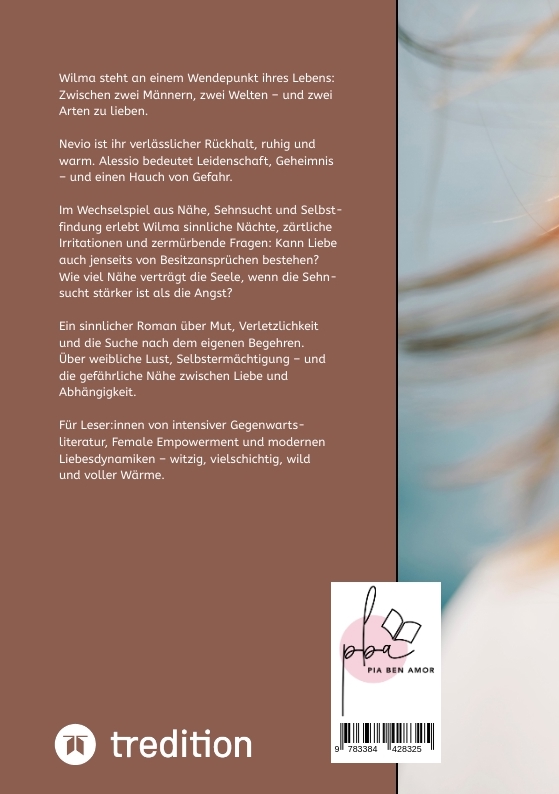 Wilma steht an einem Wendepunkt ihres Lebens: Zwischen zwei Männern, zwei Welten - und zwei Arten zu lieben. Nevio ist ihr verlässlicher Rückhalt, ruhig und warm. Alessio bedeutet Leidenschaft, Geheimnis - und ein Hauch von Gefahr.Im Wechselspiel aus Nähe, Sehnsucht und Selbstfindung erlebt Wilma sinnliche Nächte, zärtliche Irritationen und zermürbende Fragen: Kann Liebe auch jenseits von Besitzansprüchen bestehen? Und wie viel Nähe verträgt die Seele, wenn die Sehnsucht stärker ist als die Angst?Ein sinnlicher Roman über Mut, Verletzlichkeit und die Suche nach dem eigenen Begehren. Über weibliche Lust, Selbstermächtigung - und die gefährliche Nähe zwischen Liebe und Abhängigkeit. Für Leser:innen von intensiver Gegenwartsliteratur, Female Empowerment und modernen Liebesdynamiken - witzig, vielschichtig, wild und voller Wärme.