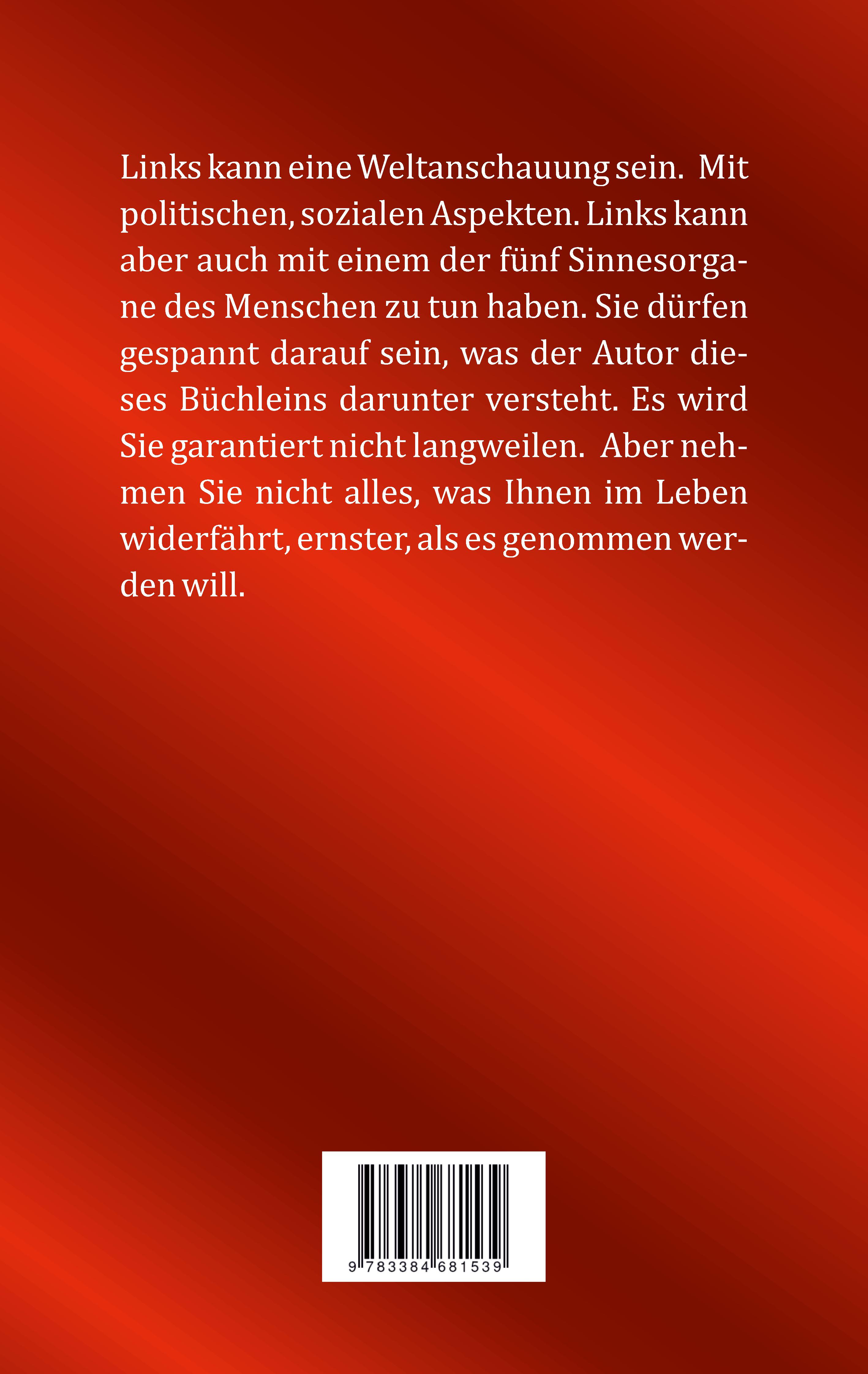 Links kann eine Weltanschauung sein. Mit politischen, sozialen Aspekten. Links kann aber auch mit einem der fünf Sinnesorgane des Menschen zu tun haben. Sie dürfen gespannt darauf sein, was der Autor dieses Büchleins darunter versteht. Es wird Sie garantiert nicht langweilen. Aber nehmen Sie nicht alles, was Ihnen im Leben widerfährt, ernster, als es genommen werden will.