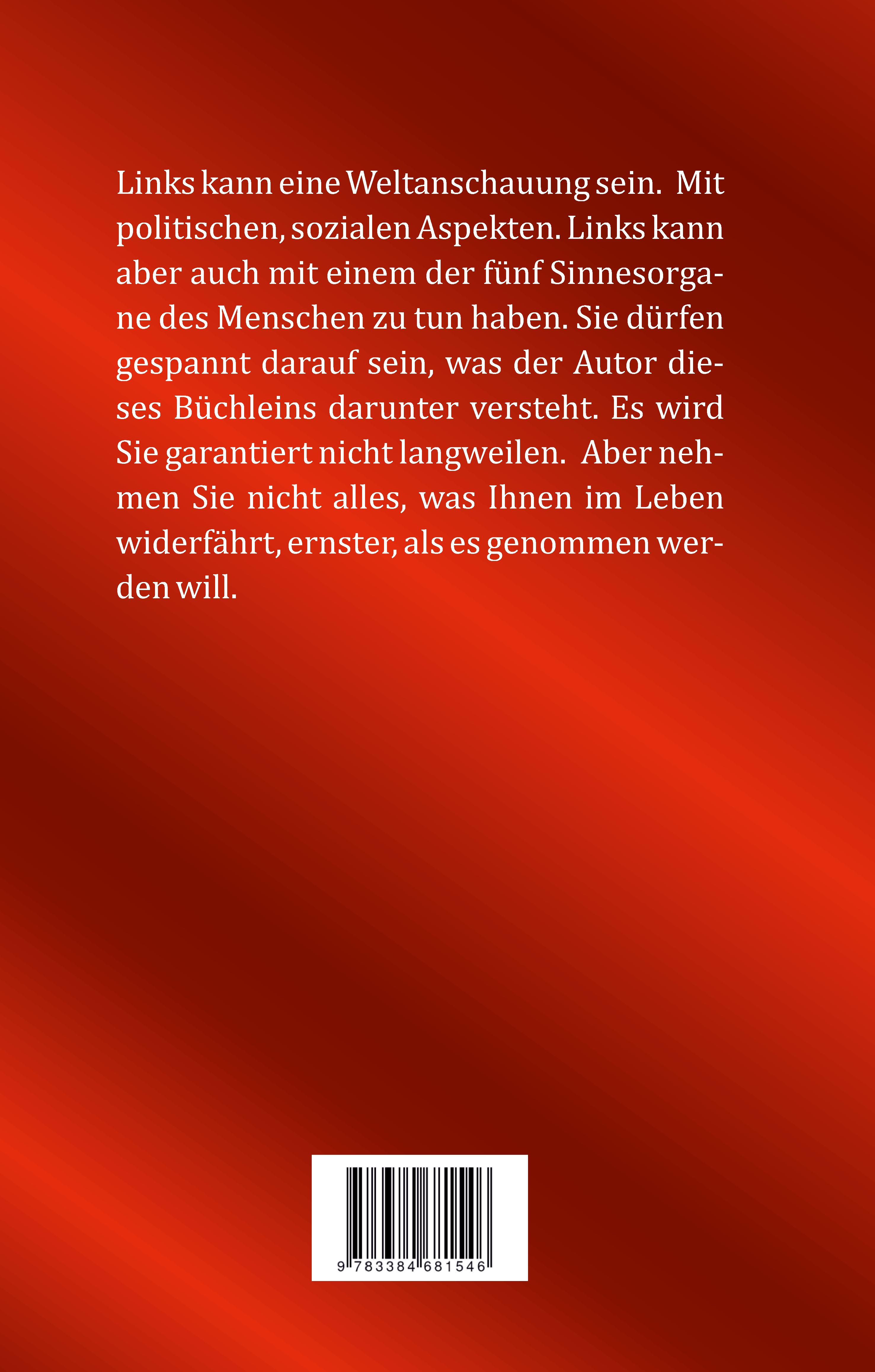 Links kann eine Weltanschauung sein. Mit politischen, sozialen Aspekten. Links kann aber auch mit einem der fünf Sinnesorgane des Menschen zu tun haben. Sie dürfen gespannt darauf sein, was der Autor dieses Büchleins darunter versteht. Es wird Sie garantiert nicht langweilen. Aber nehmen Sie nicht alles, was Ihnen im Leben widerfährt, ernster, als es genommen werden will.
