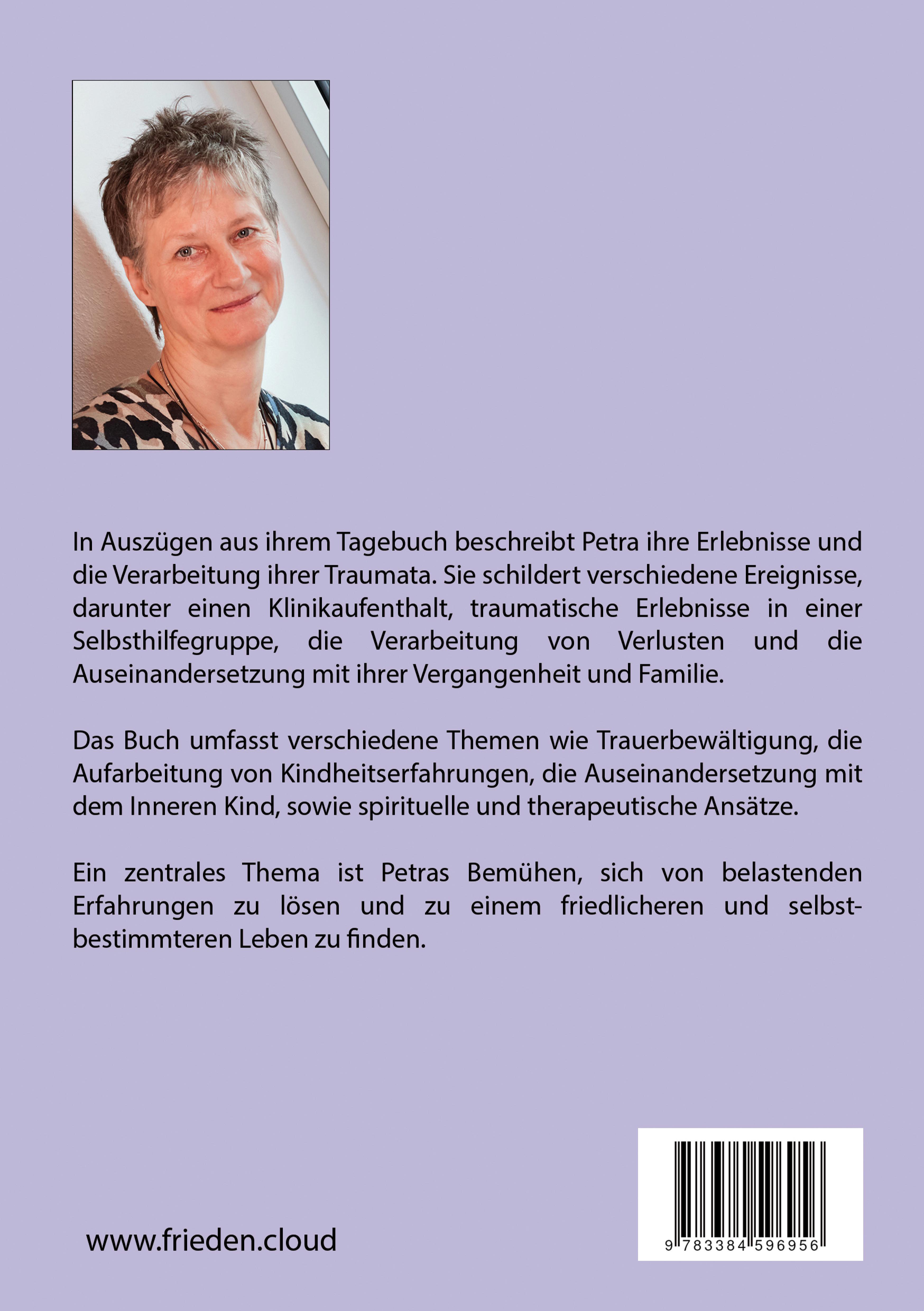 In Auszügen aus ihrem Tagebuch beschreibt Petra ihre Erlebnisse und die Verarbeitung ihrer Traumata. Sie schildert verschiedene Ereignisse, darunter einen Klinikaufenthalt, traumatische Erlebnisse in einer Selbsthilfegruppe, die Verarbeitung von Verlusten und die Auseinandersetzung mit ihrer Vergangenheit und Familie. Das Buch umfasst verschiedene Themen wie Trauerbewältigung, die Aufarbeitung von Kindheitserfahrungen, die Auseinandersetzung mit dem Inneren Kind, sowie spirituelle und therapeutische Ansätze.Ein zentrales Thema ist Petras Bemühen, sich von belastenden Erfahrungen zu lösen und zu einem friedlicheren und selbstbestimmteren Leben zu finden.